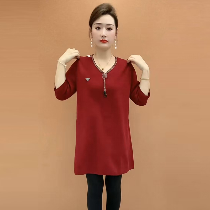 秋冬高端时尚洋气V领针织大版衫宽松妈妈装弹力中长款打底毛衣裙