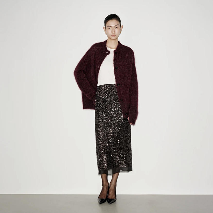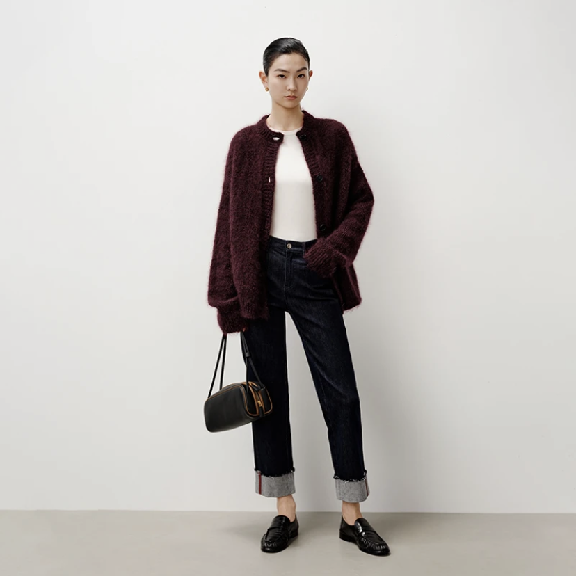艾诺丝2025秋季新款纯色宽松休闲中长款毛针织衫开衫女184115