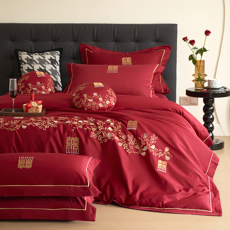 100支结婚四件套大红色刺绣喜庆被套全棉婚庆婚房牀上用品