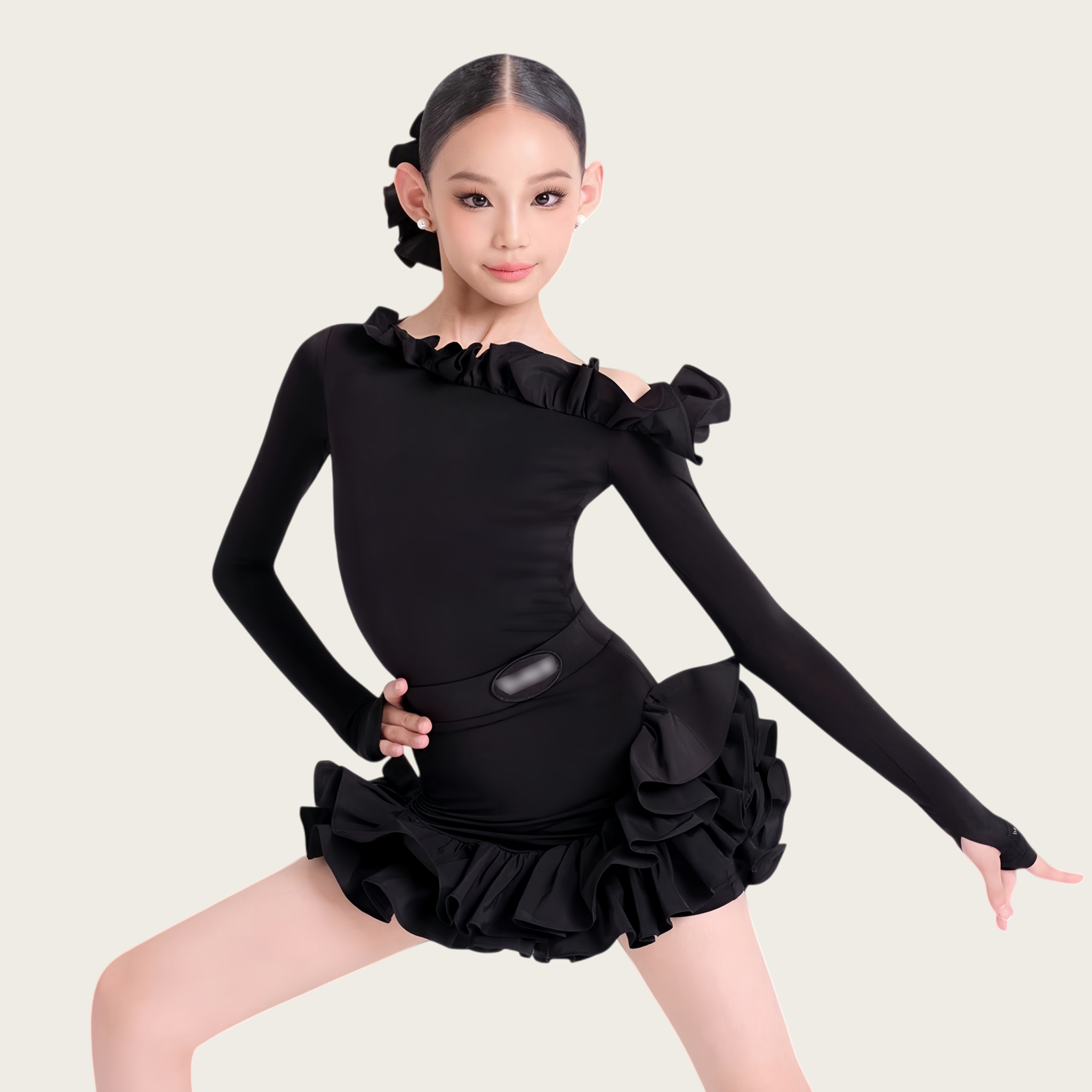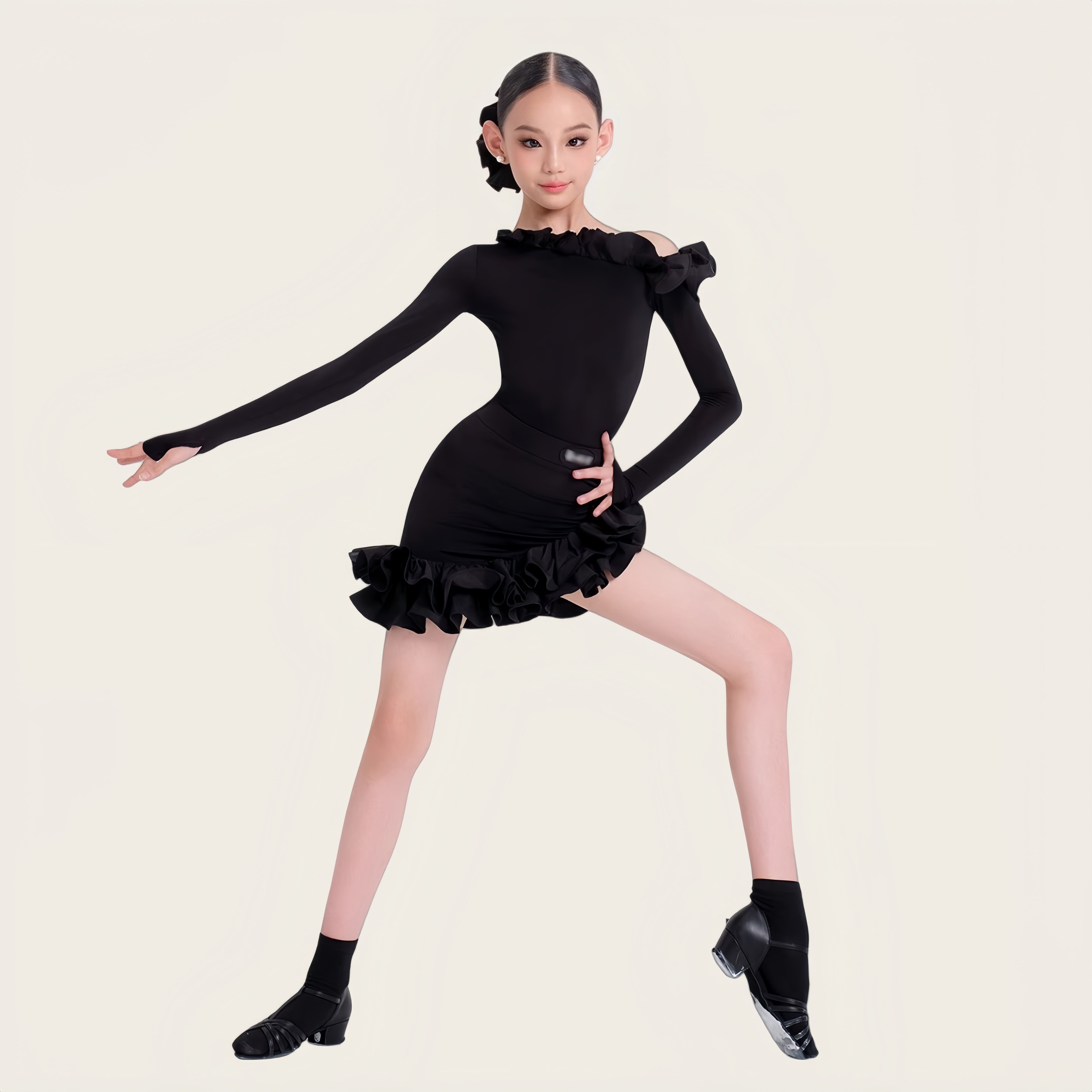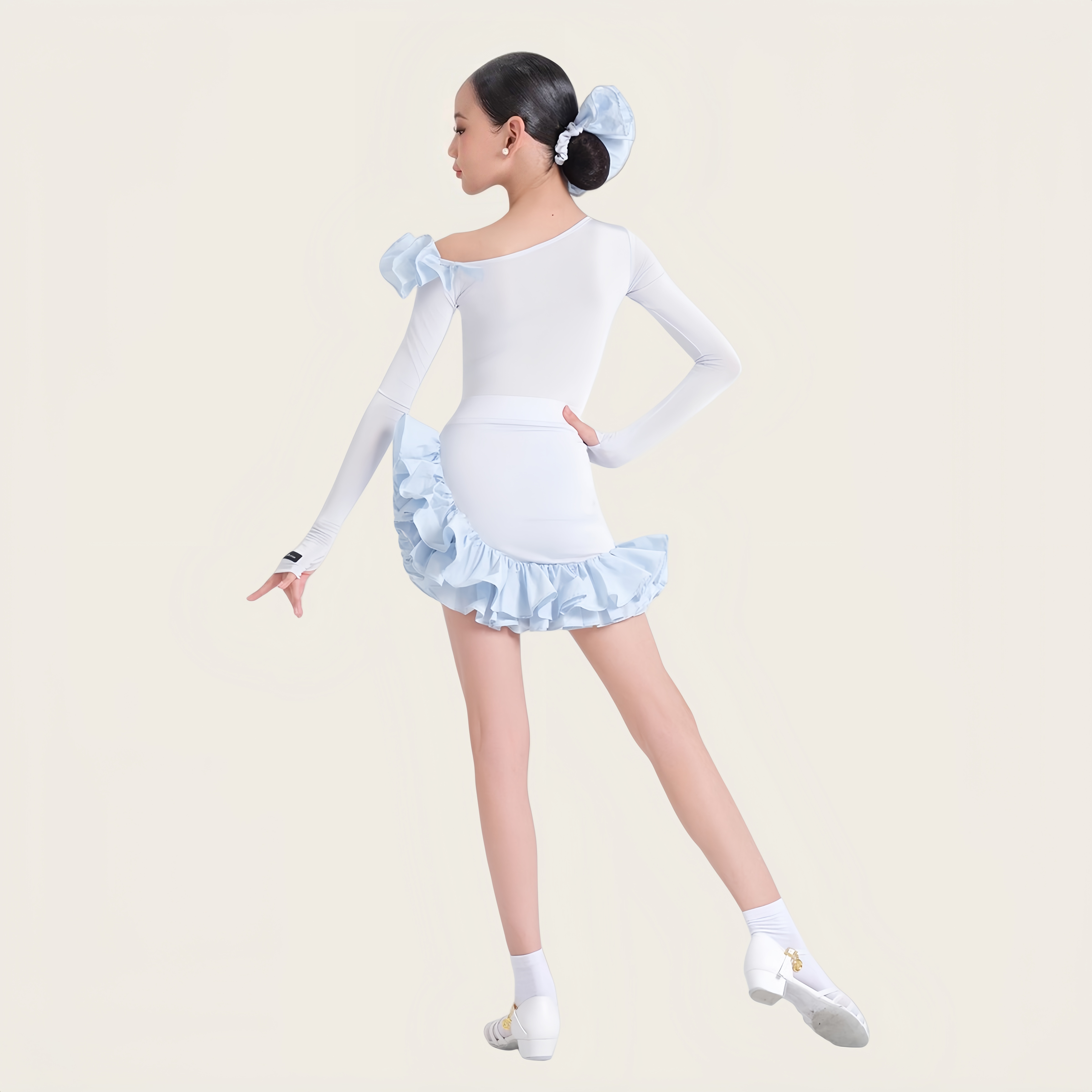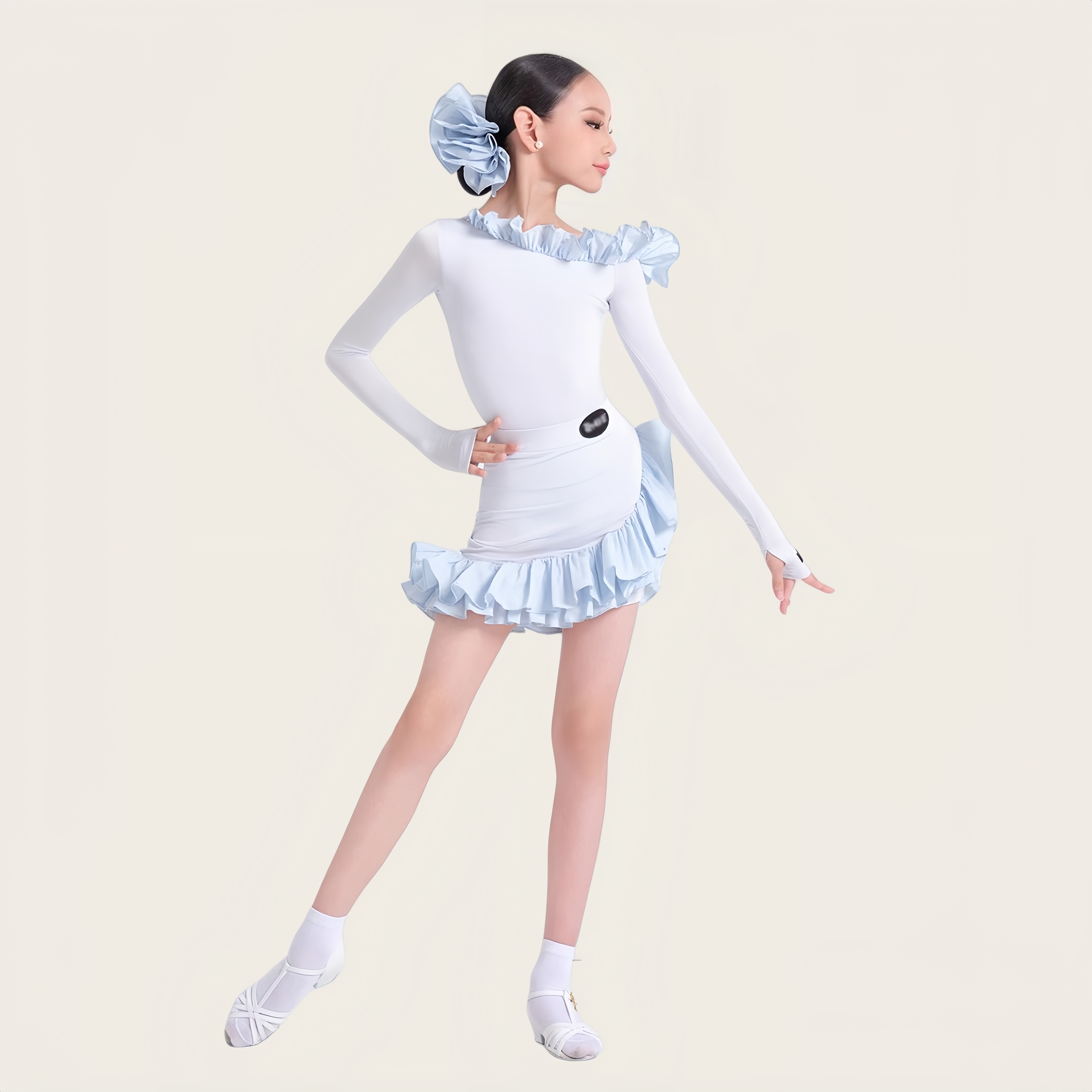 未午同款冬季女童拉丁舞服梦幻晶浪长袖花边上衣分体波浪纹半裙