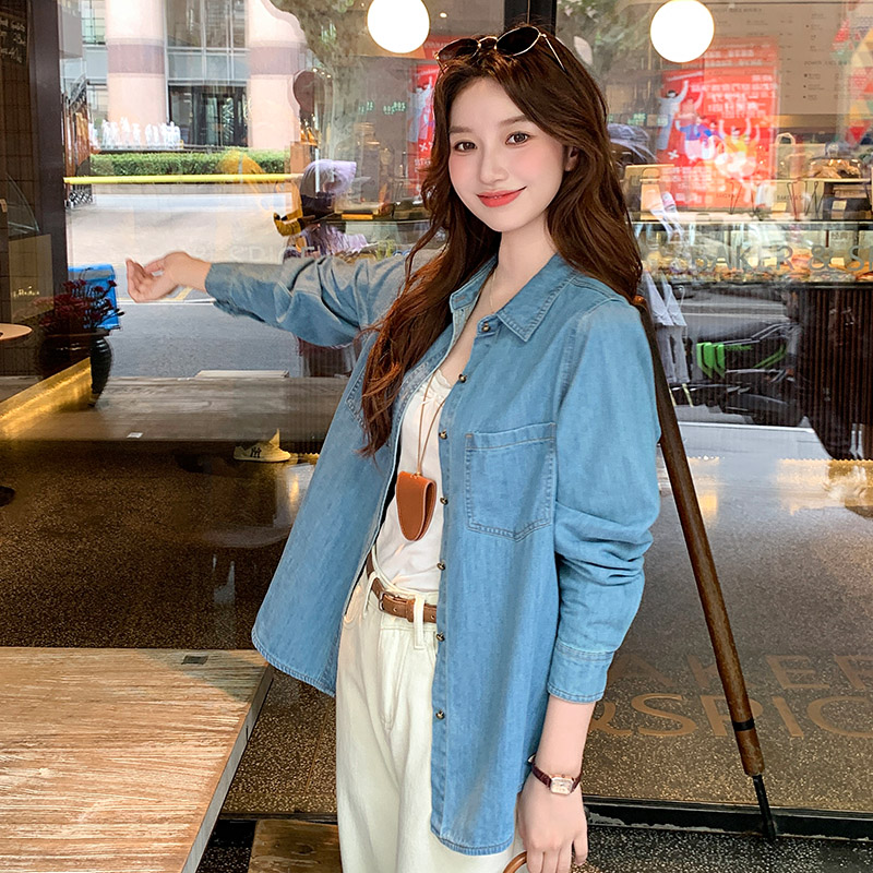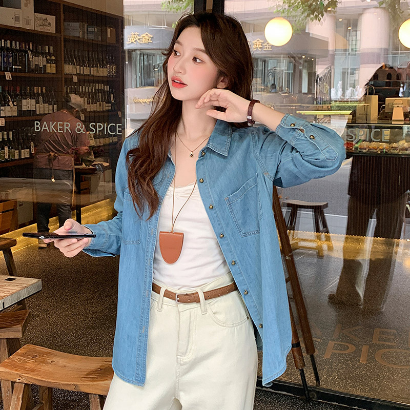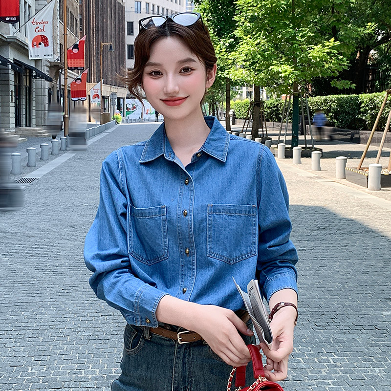 蓝色牛仔衬衫女2025新款春秋小个子内搭长袖衬衣外套美式复古上衣