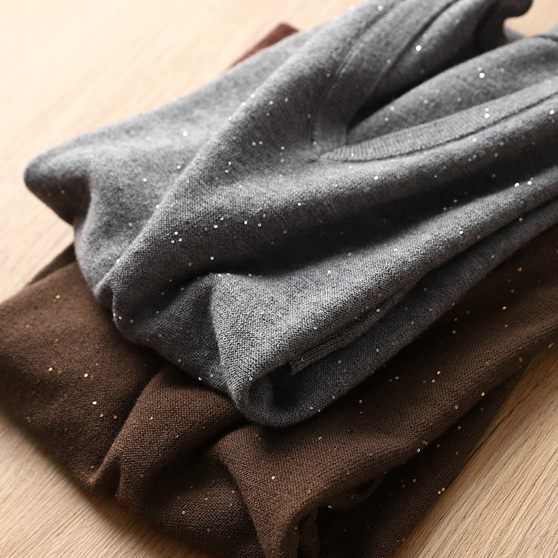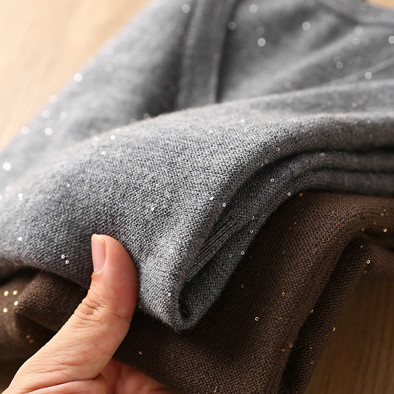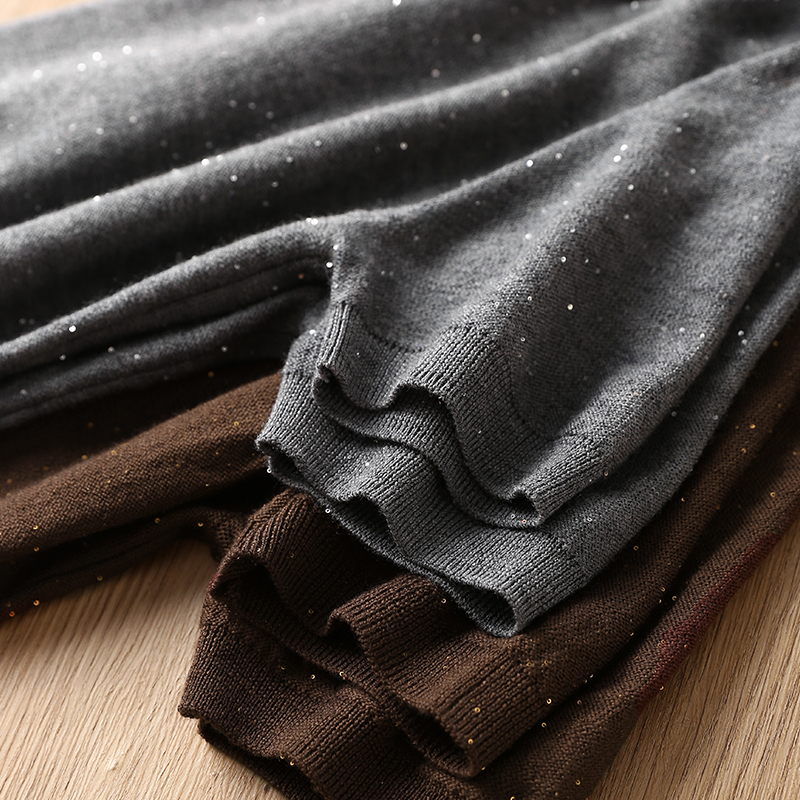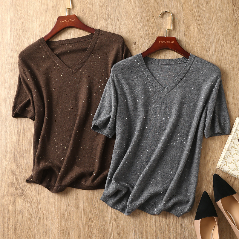 淘么淘 E家同款!纯羊毛亮丝微闪亮片V领短袖针织衫t恤女秋新款