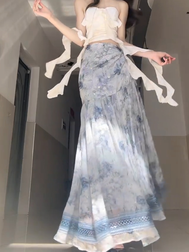 李不婉蓝色扎染半身裙女夏季新款云南仙女裙子高腰海边度假长裙