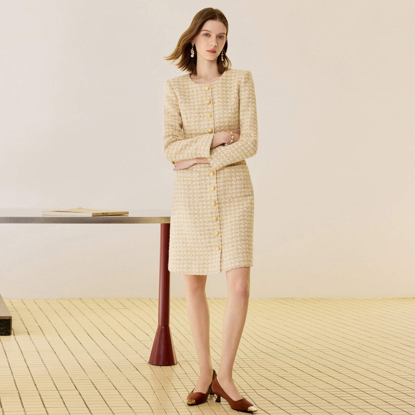 艾尚臣羊毛小香风连衣裙女粗花呢中长款名媛千鸟格法式浅黄色礼服