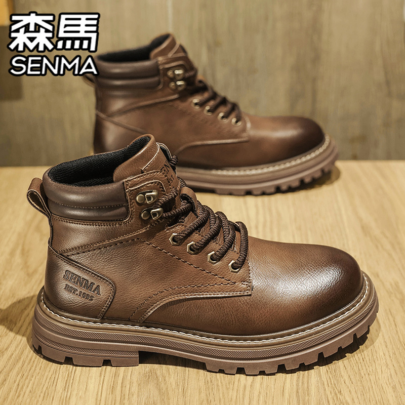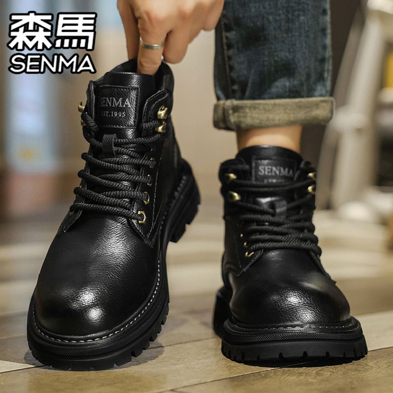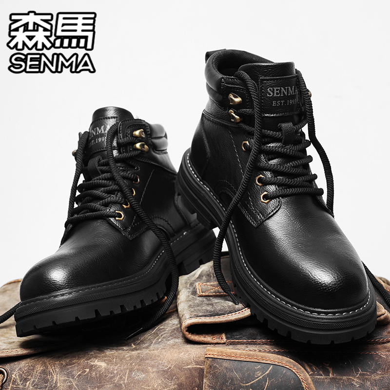 森马马丁靴男鞋秋季高帮英伦风运动工装板鞋真皮防水休闲骑行皮靴