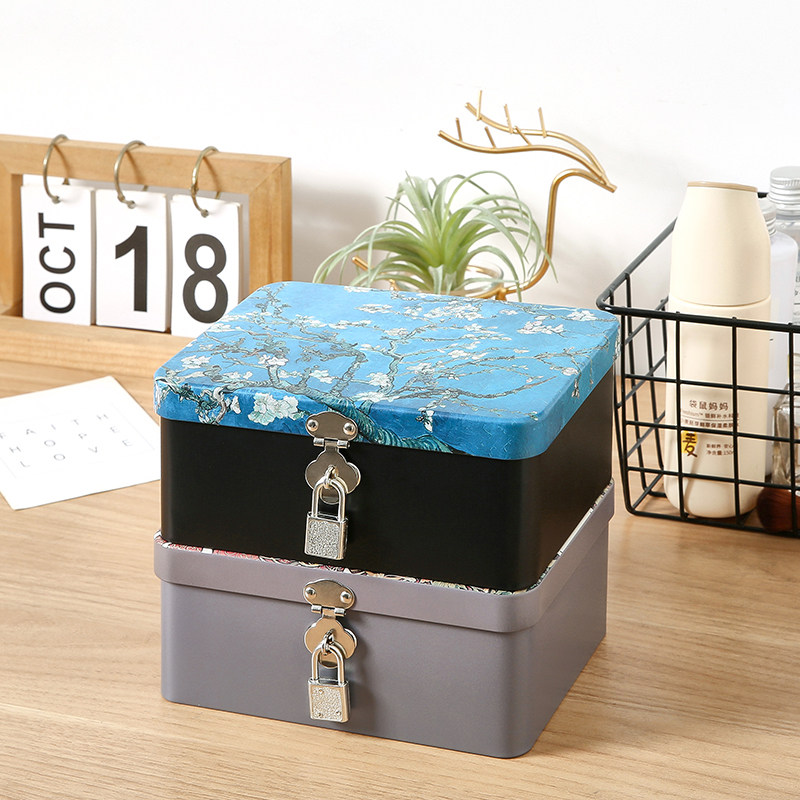 复古马口铁盒子带锁收纳盒钥匙桌面化妆品储物家用首饰小箱子