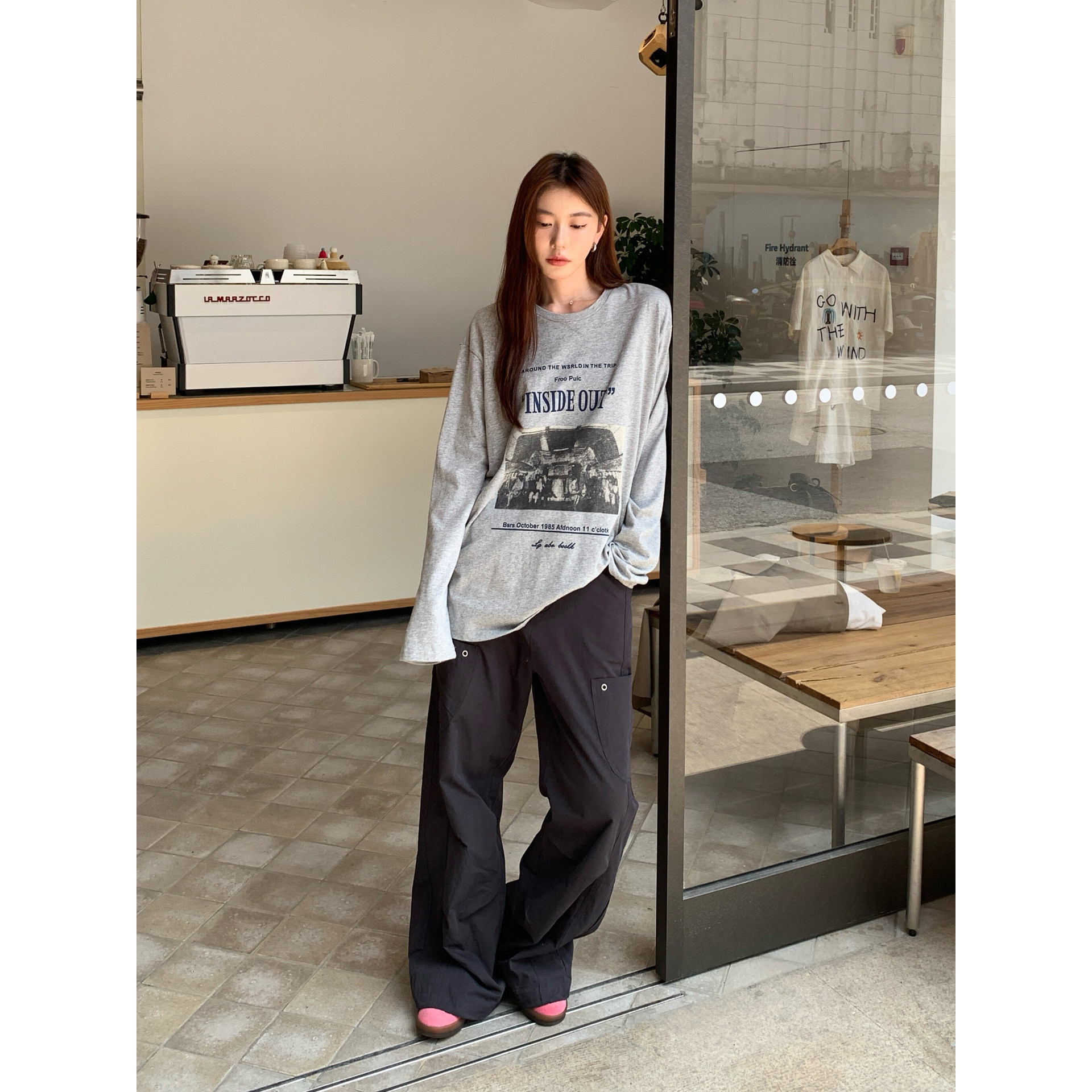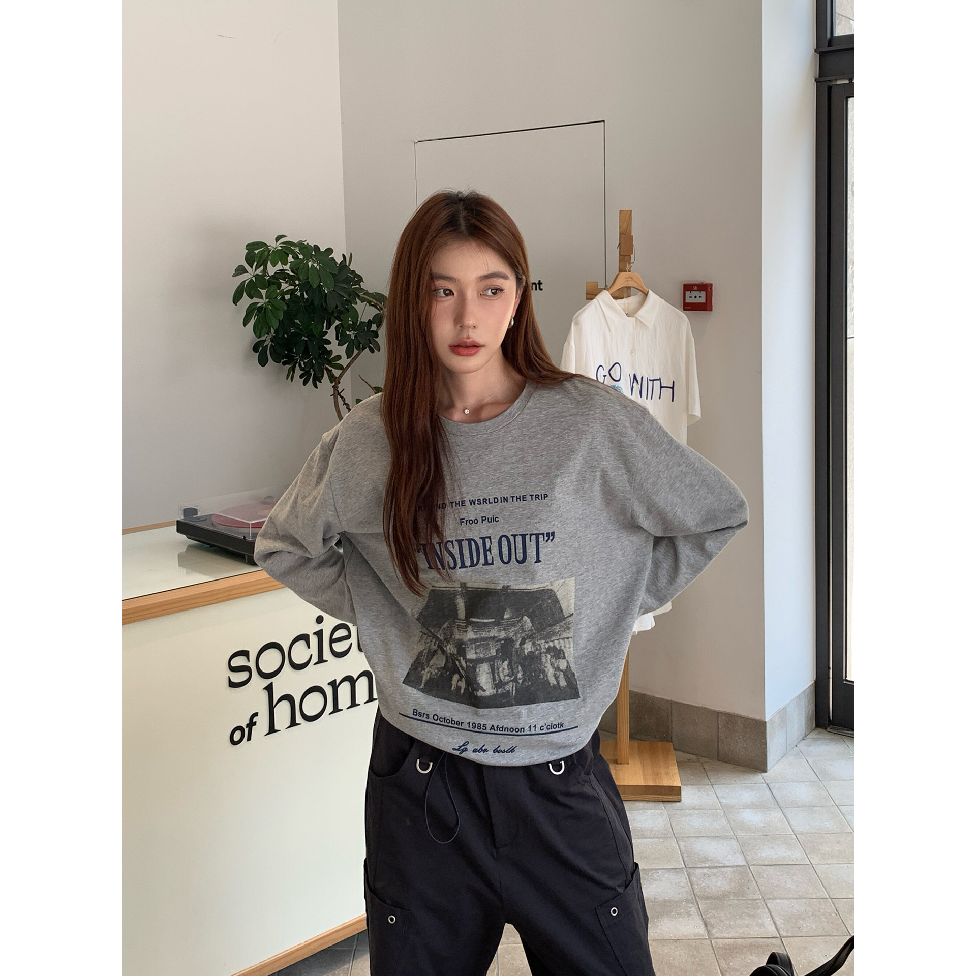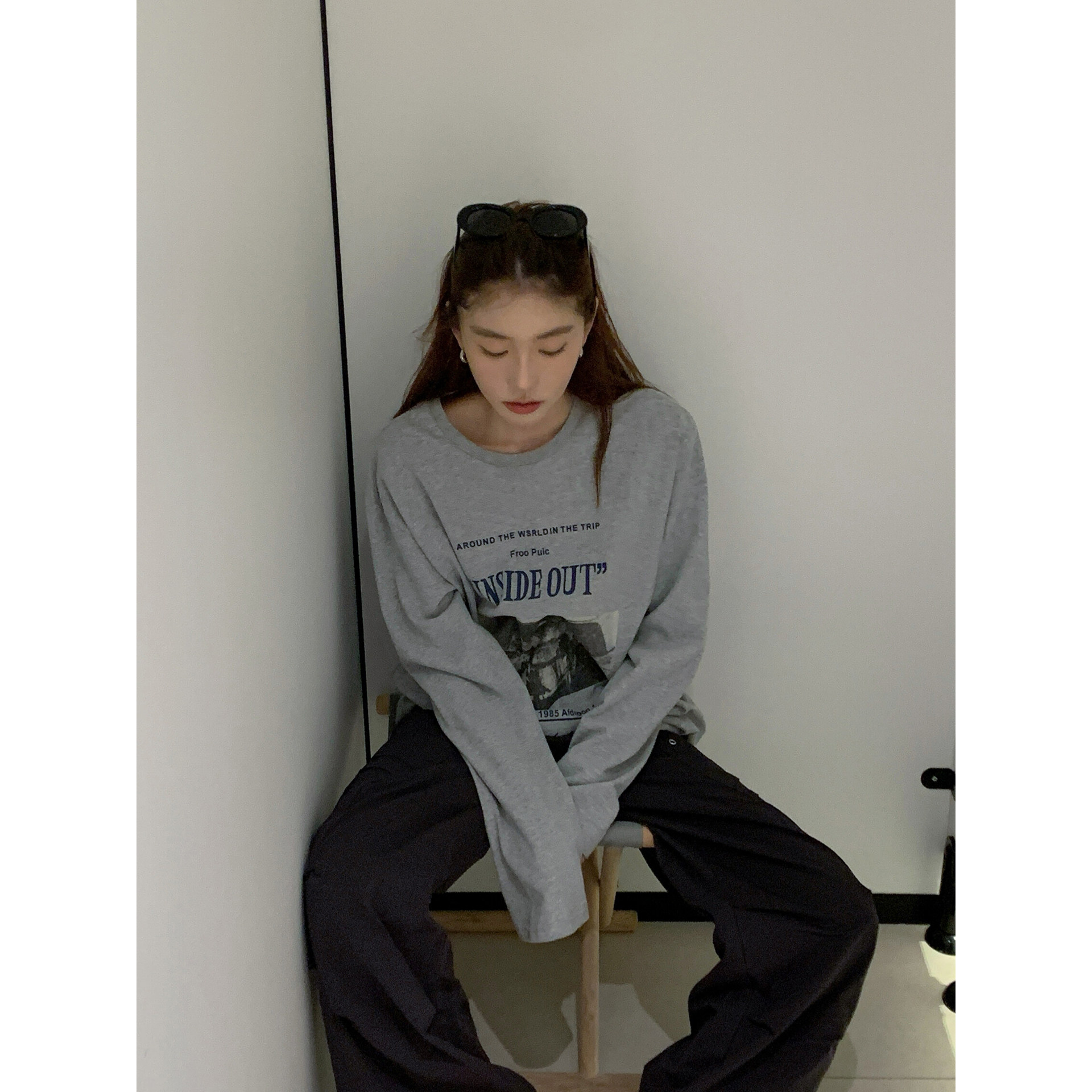 Halo Luu 灰色长袖t恤女早秋新款韩系字母印花纯棉慵懒风宽松上衣