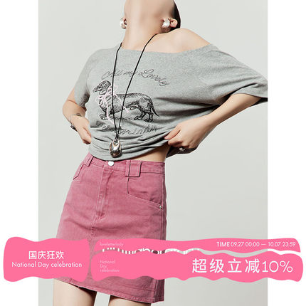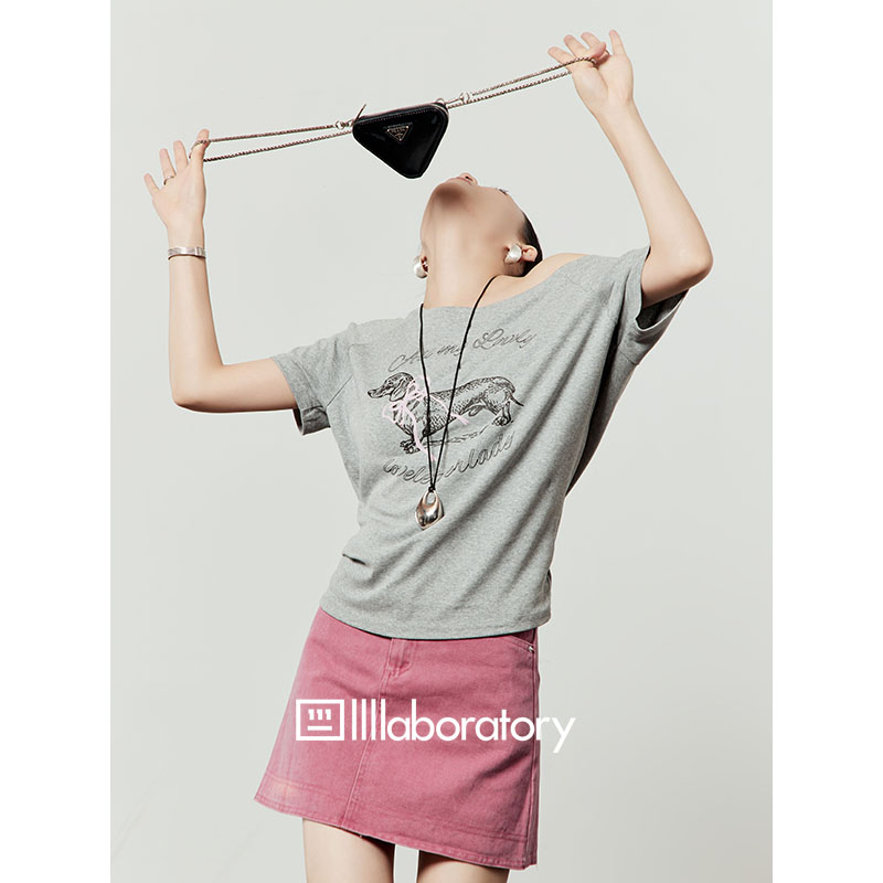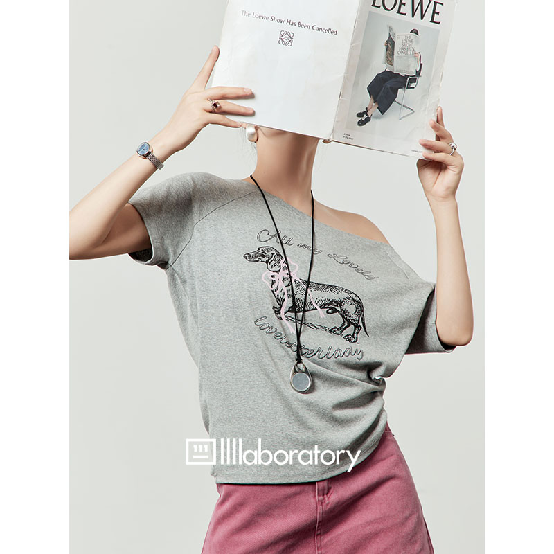 「周里物出品」花灰色T恤女25夏季新款印花宽松休闲通勤露肩短袖