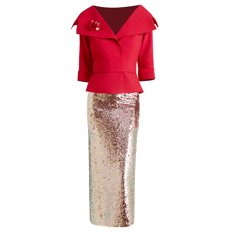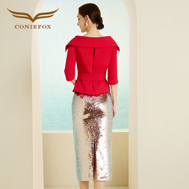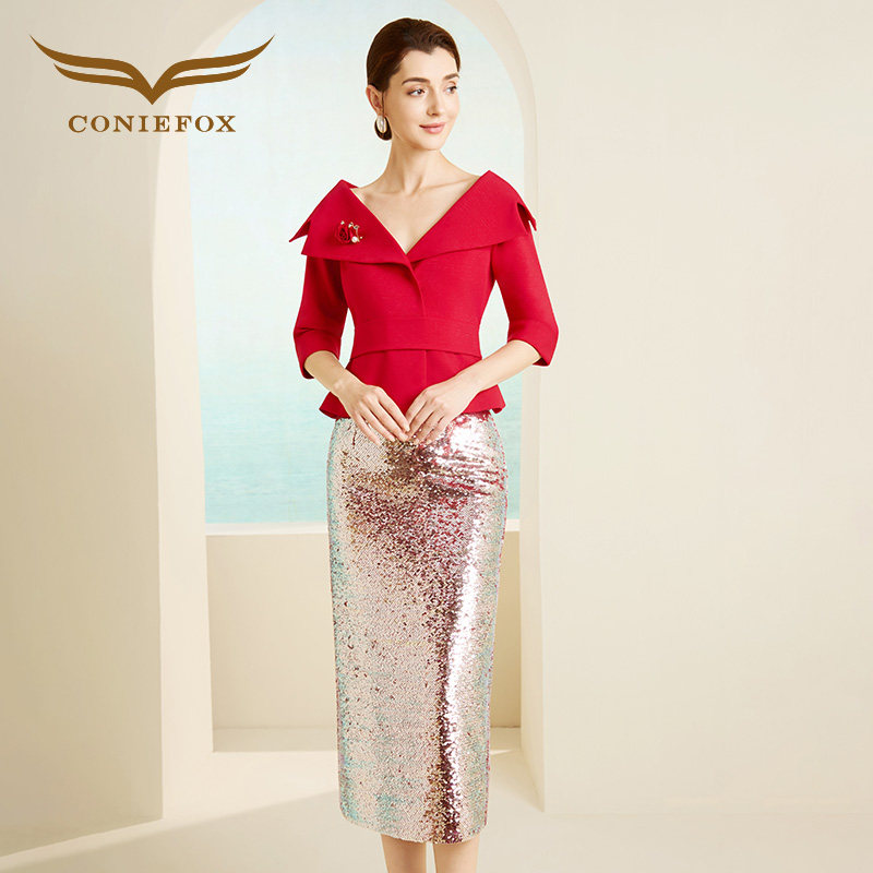 创意狐法式轻奢红色套装V领修身显瘦主持聚会亮片高级日常礼服裙