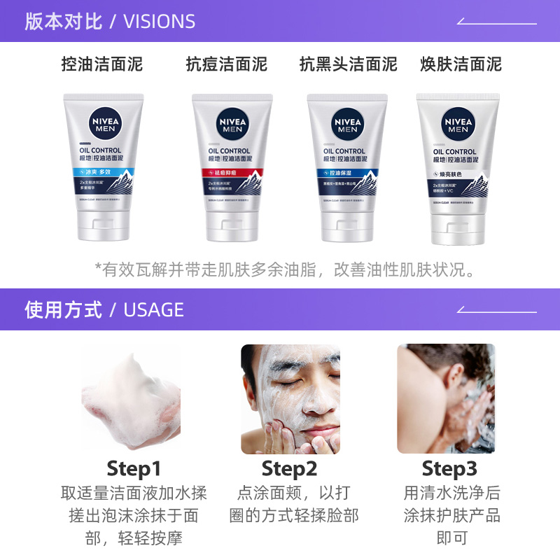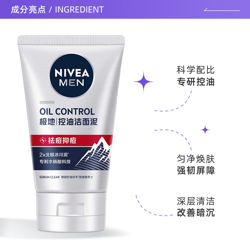 【自营】Nivea/妮维雅男士冰川洁面泥控油抗痘深层清洁毛孔洗面奶