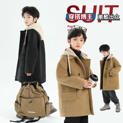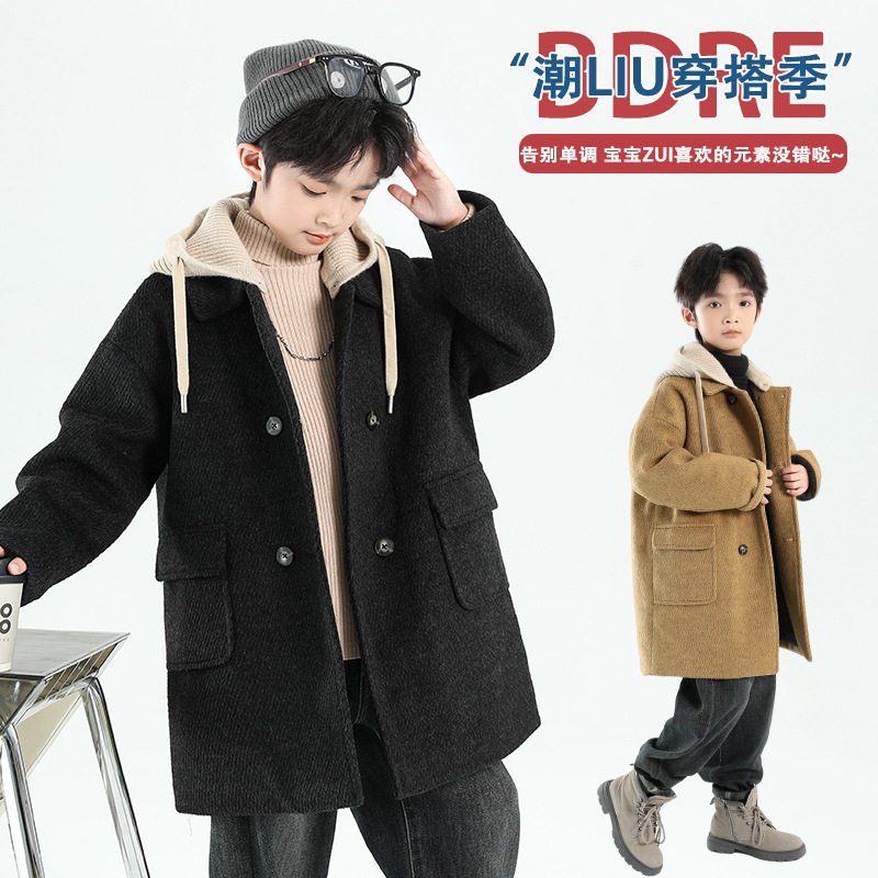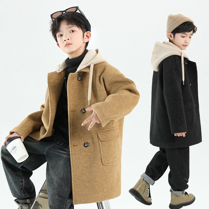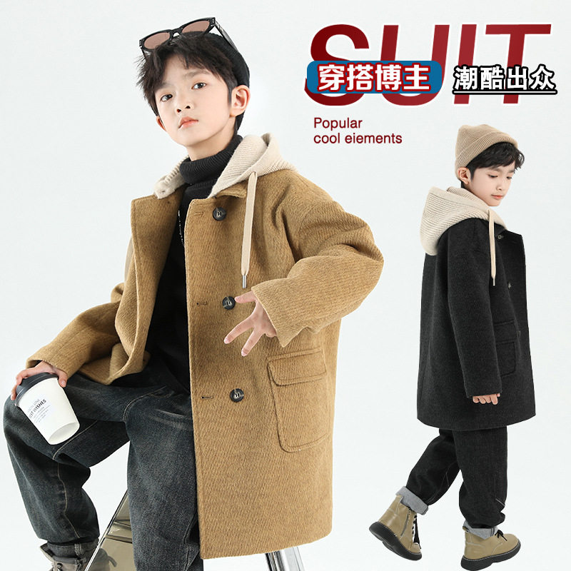 高品质男童呢子大衣外套2025秋冬装新款中大童加厚中长款连帽风衣