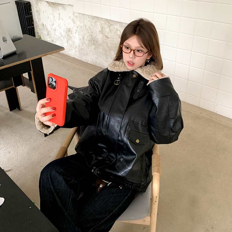 橘子树在哪儿美式复古高级感机车皮衣女冬季皮毛一体保暖夹棉外套