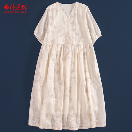 布朴家作2025夏季新款文艺100支精细苎麻刺绣文艺休闲清凉连衣裙