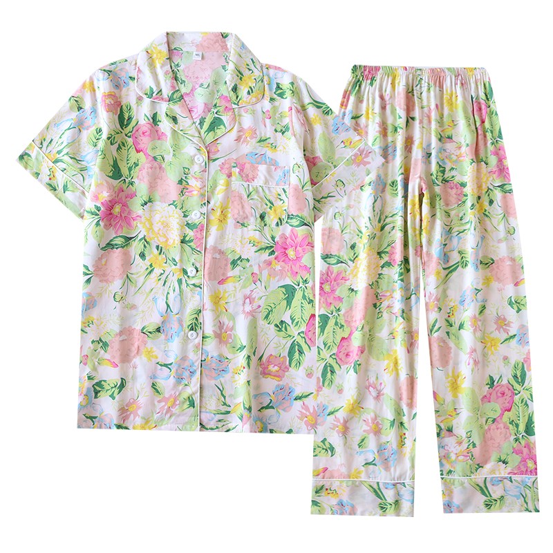 2025春夏季薄款女睡衣人棉短袖长裤家居服套装凉爽全绵绸翻领新款