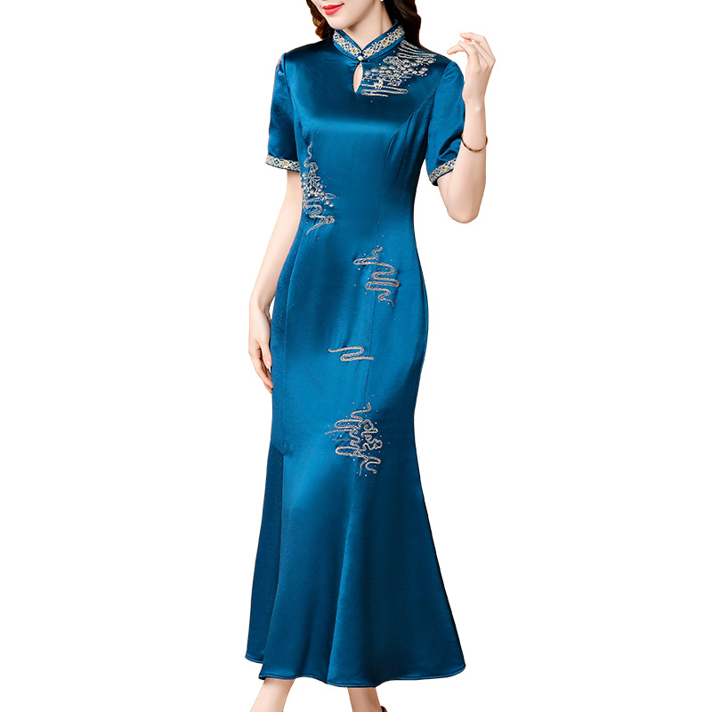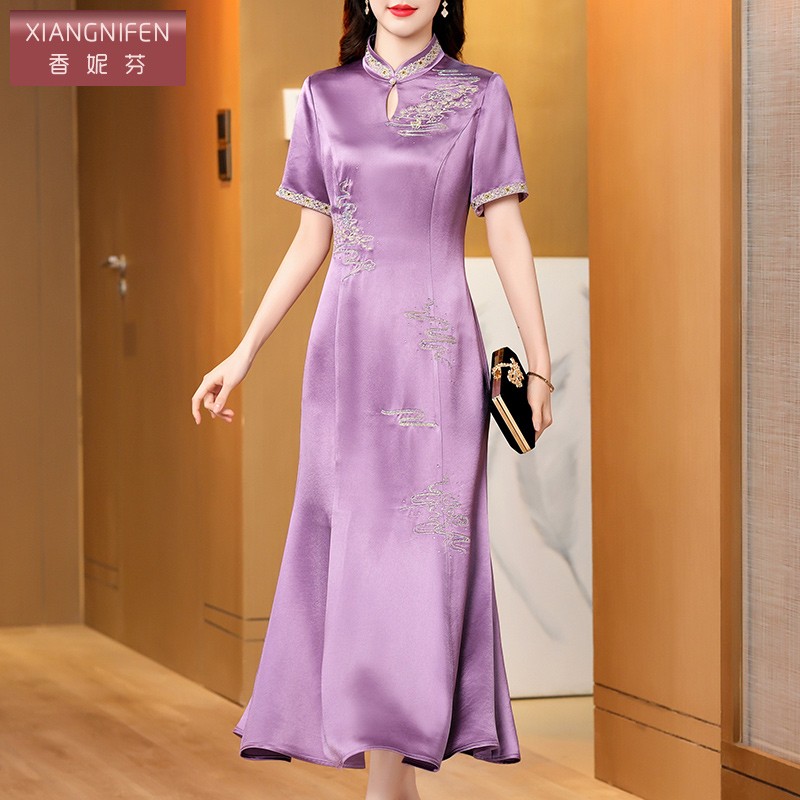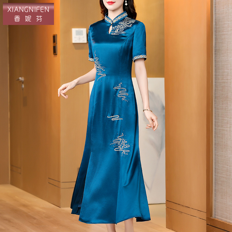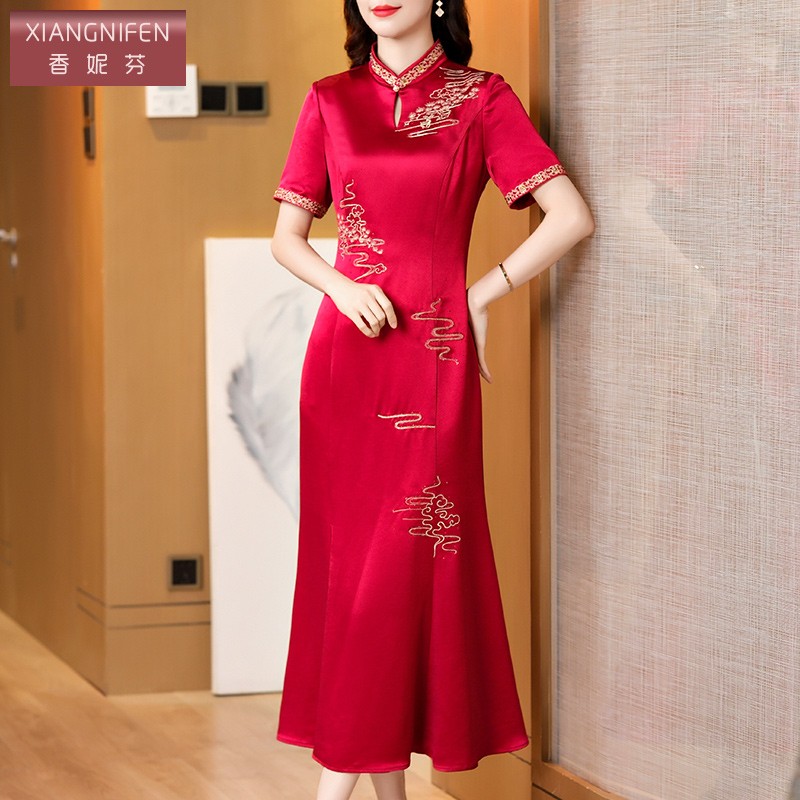 香妮芬醋酸缎面收腰年轻洋气妈妈结婚装礼服2025新款夏婚宴连衣裙