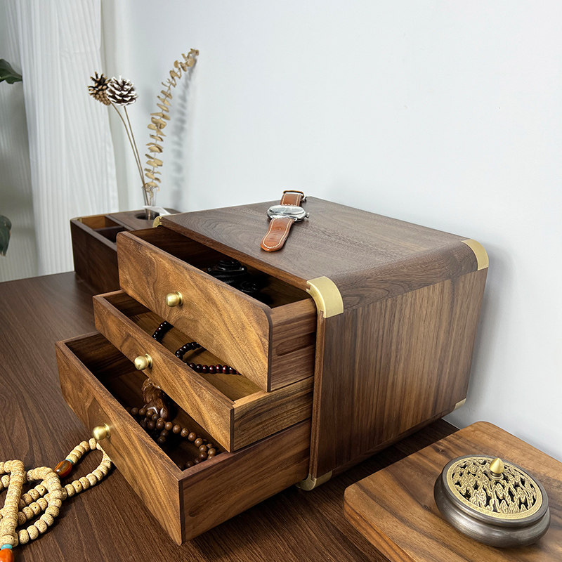 黑胡桃木三层抽屉柜桌面多层抽屉文玩收纳盒首饰盒化妆收纳柜实木