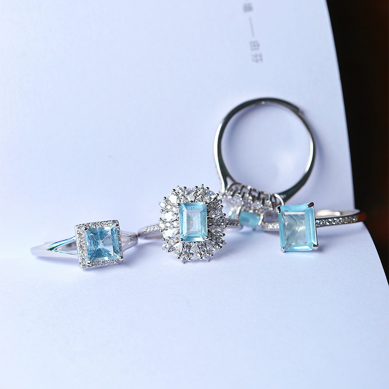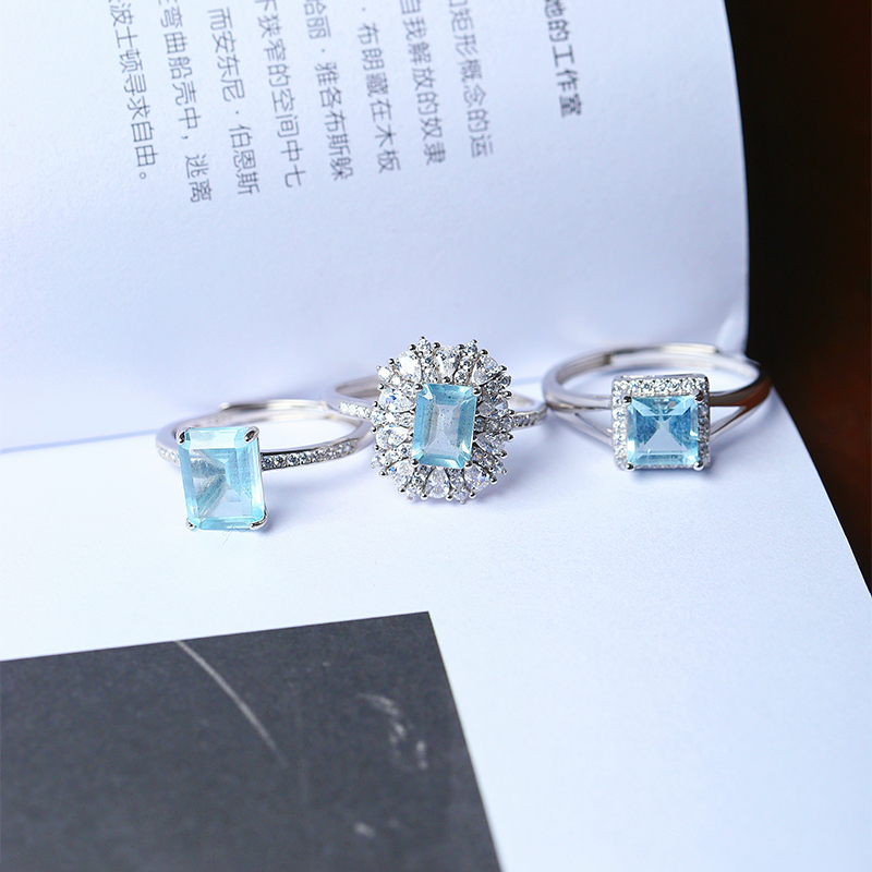 精品彩宝天然海蓝宝石净体裸石纯银镶嵌戒指女水晶戒指多样性发货