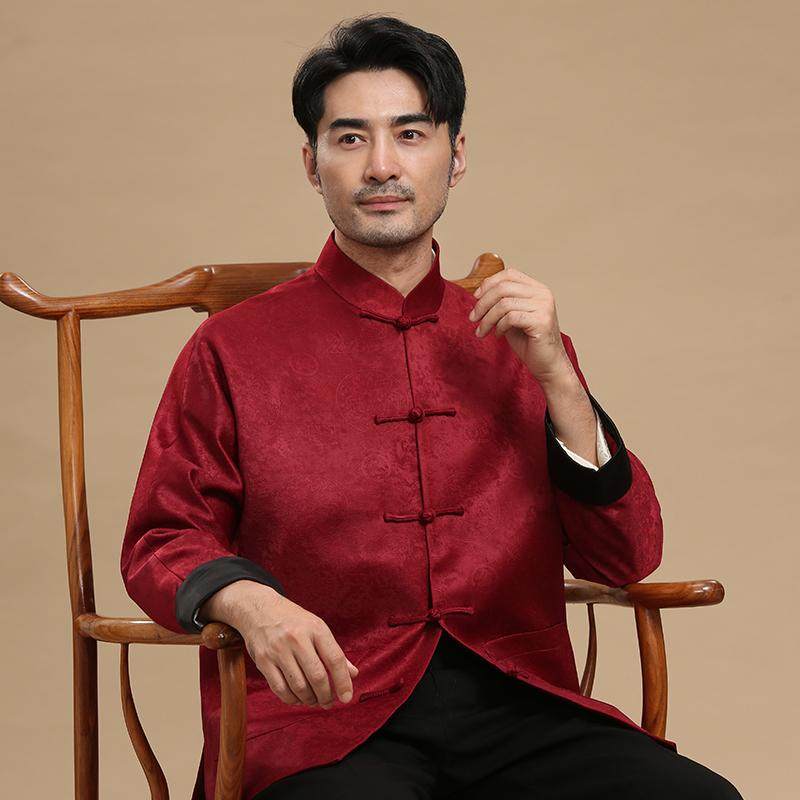 唐装男中老年翻袖春秋长袖外套中式立领盘扣休闲中国风爸爸装上衣