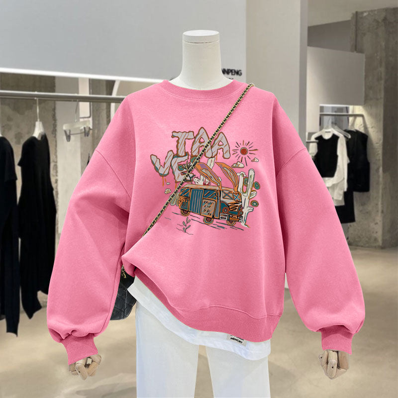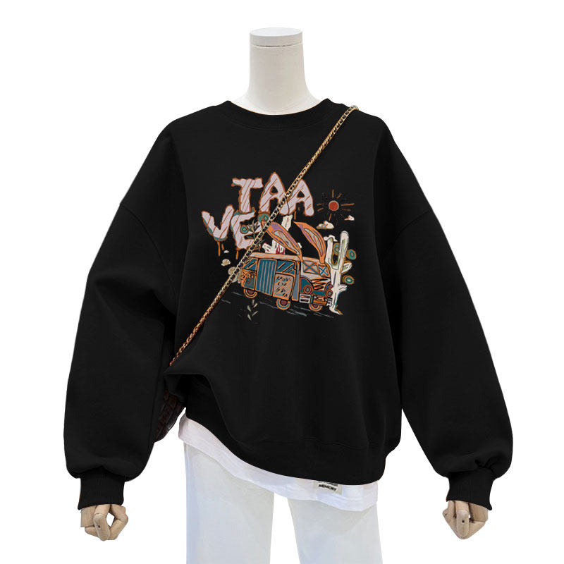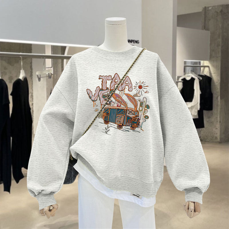 卡通兔子汽车圆领卫衣女2025春秋冬加绒加厚假两件中长款遮屁股潮