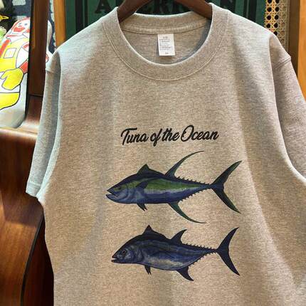 美式复古 vintage 海洋金枪鱼 纯棉265克重磅圆领情侣T恤做旧