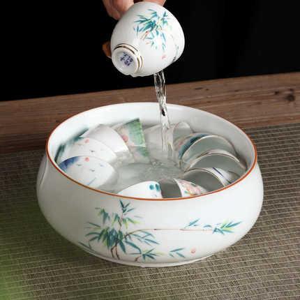笔洗缸陶瓷茶碗茶具 水洗配件收纳 茶道盆洗茶大号缸功夫茶杯手绘