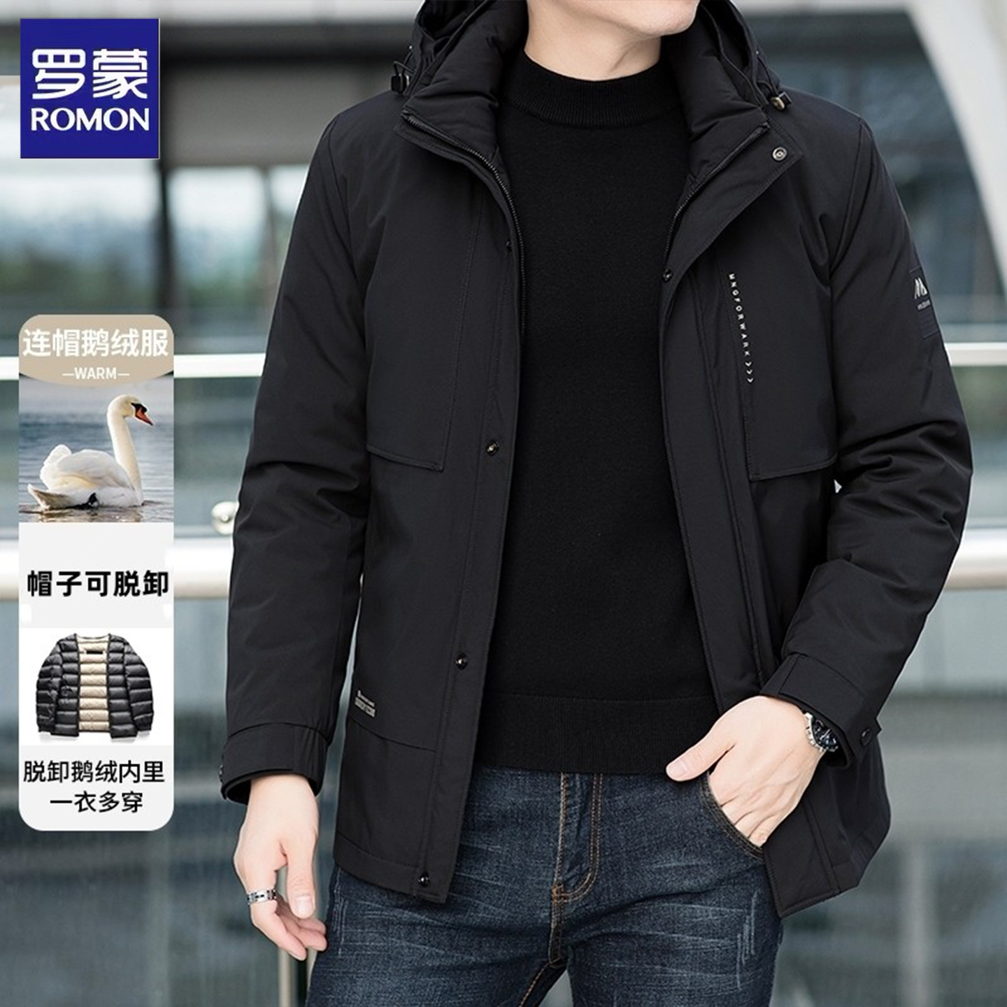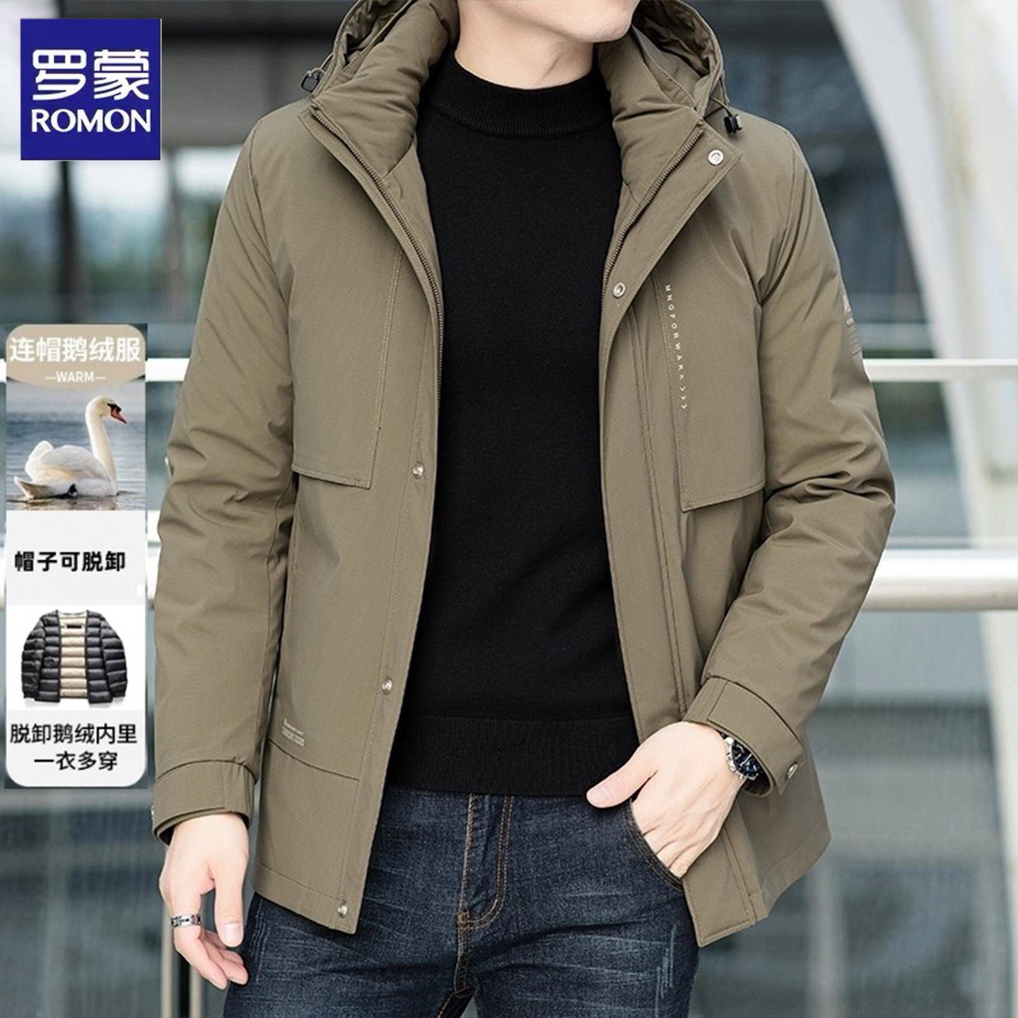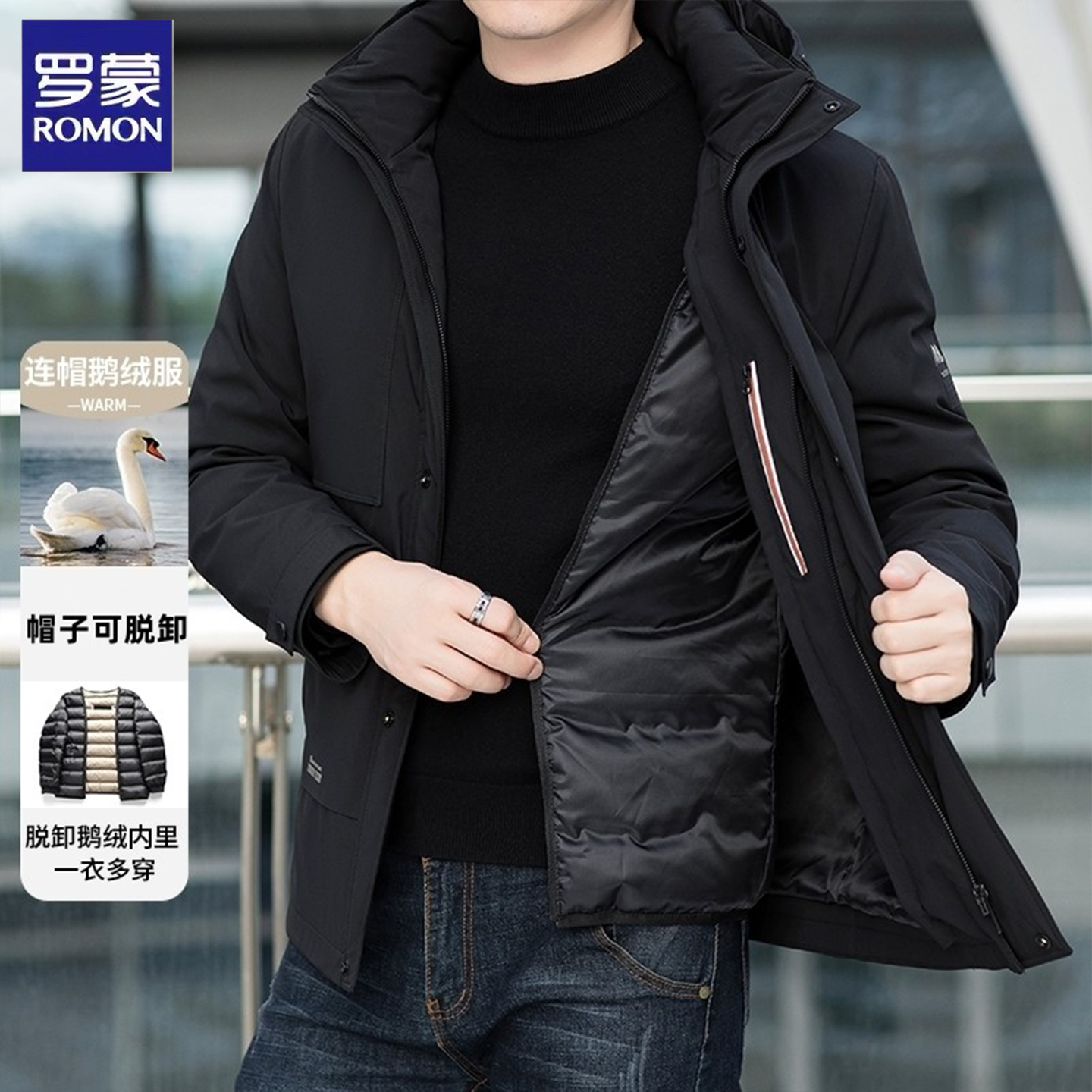 罗蒙男士鹅绒羽绒服冬季新款加厚防风保暖可拆卸内胆上衣外套