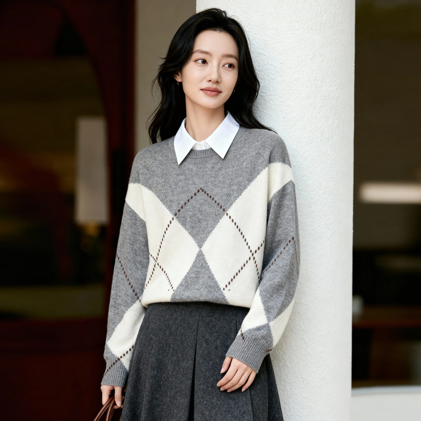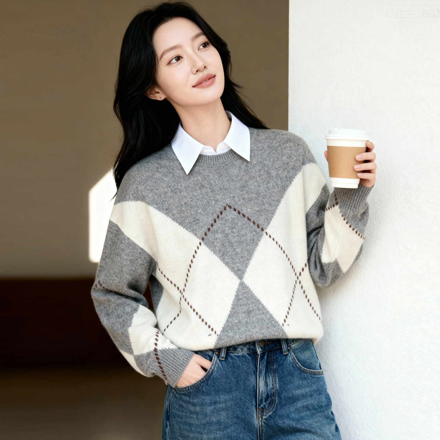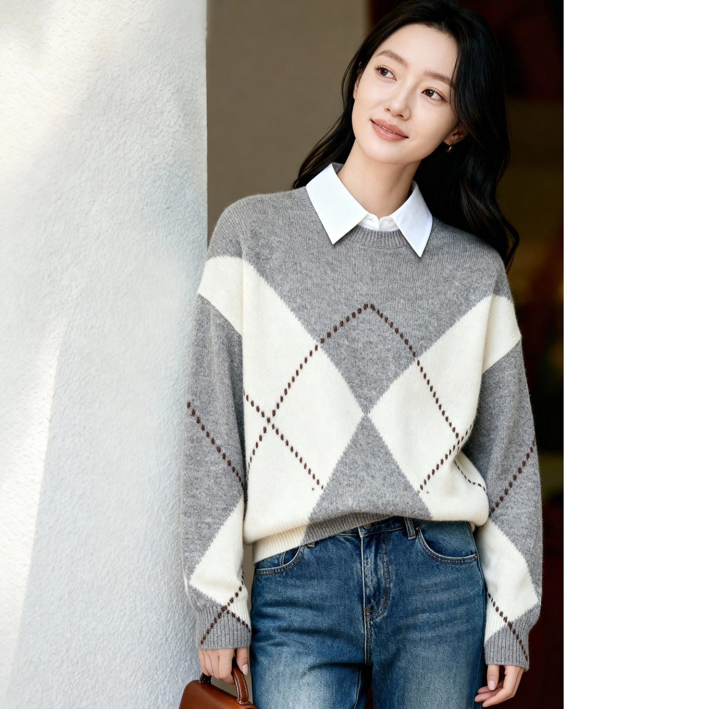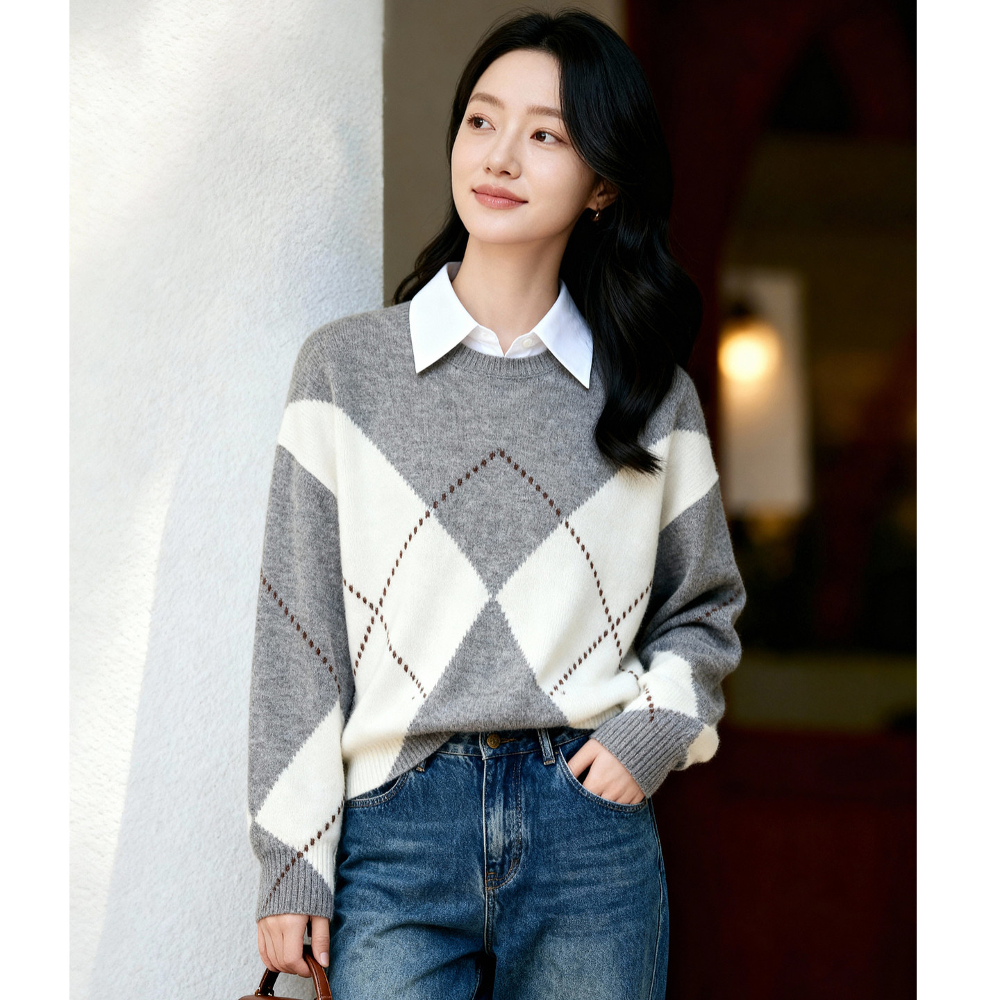 百家好绵羊毛加厚保暖菱格毛衣女冬季新款复古套头针织衫冬装上衣