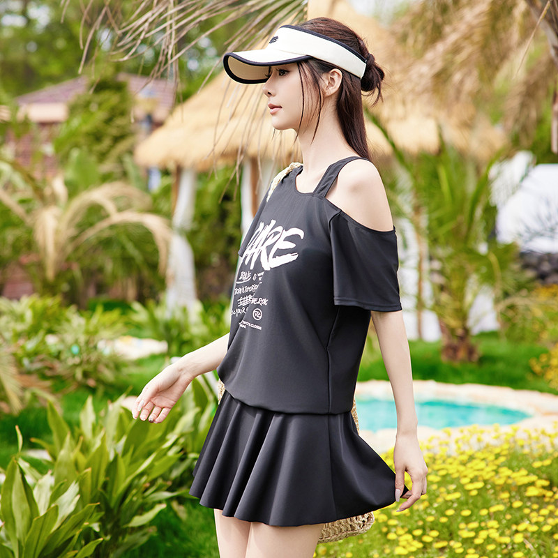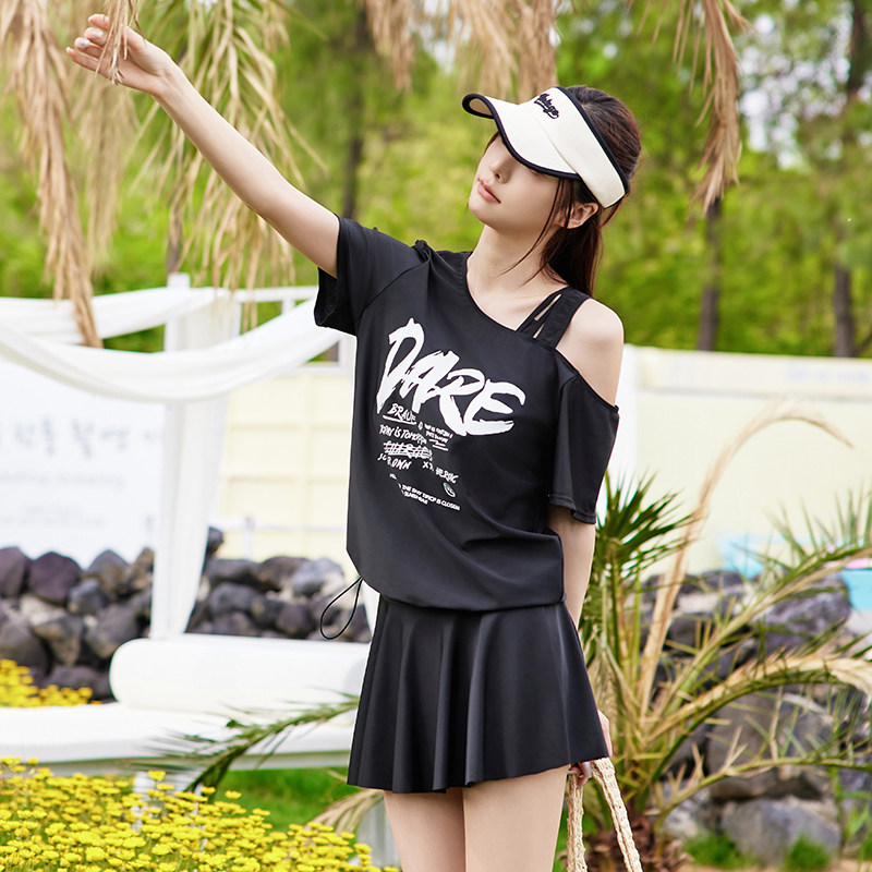 水上乐园泳衣女大码三件套温泉裙式遮肚显瘦微胖女孩遮肉斜肩黑色