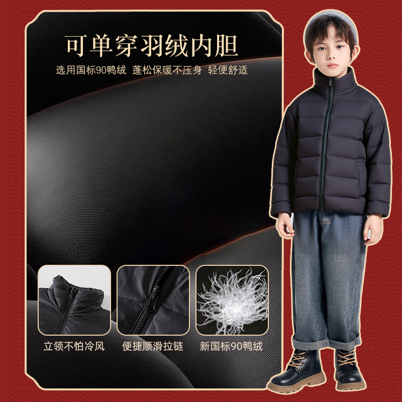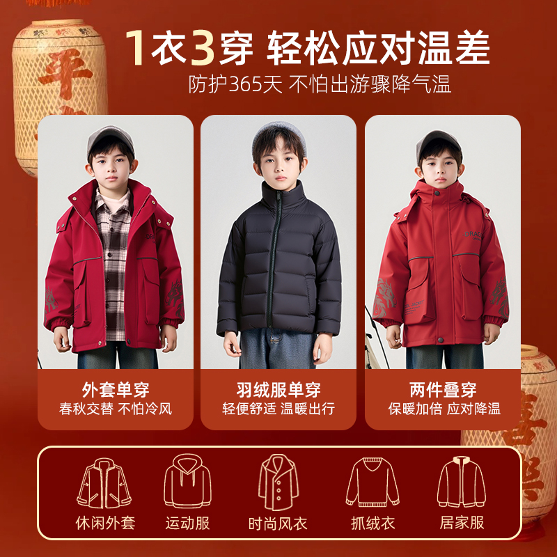 罗蒙童装男童红色羽绒服冬季拜年服加厚2025新款三合一冲锋外套潮