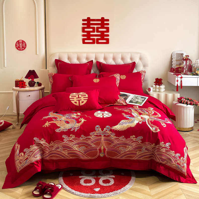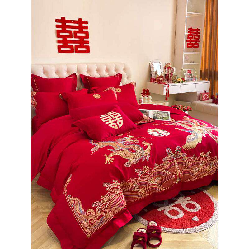 高档喜庆结婚床上用品四件套大红色龙凤刺绣被套床单纯棉喜被婚庆