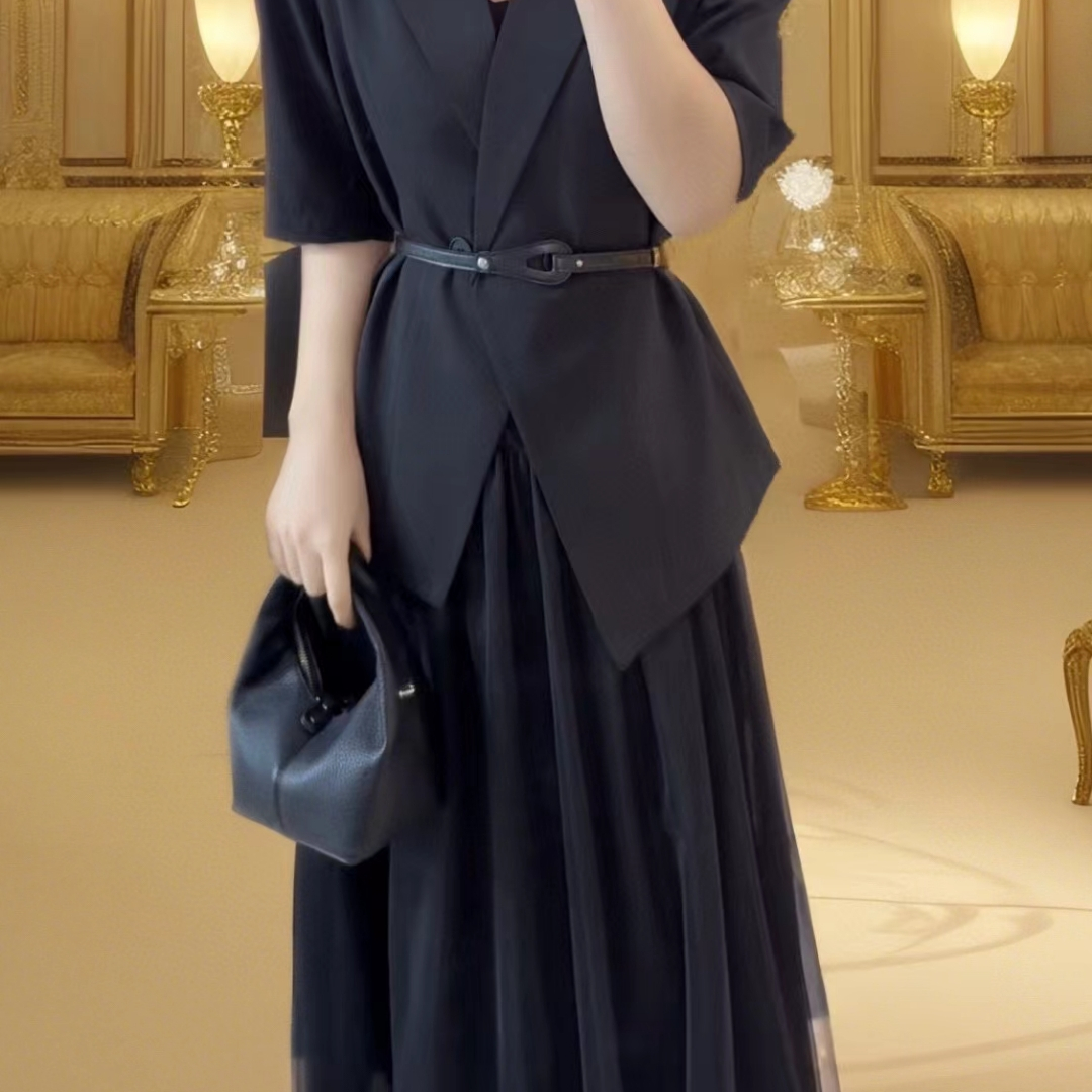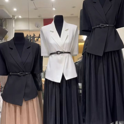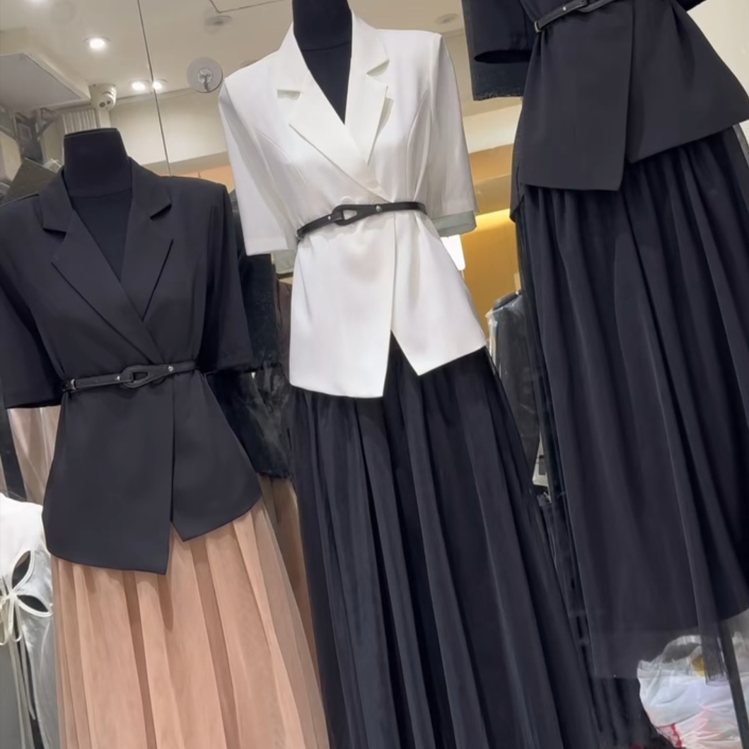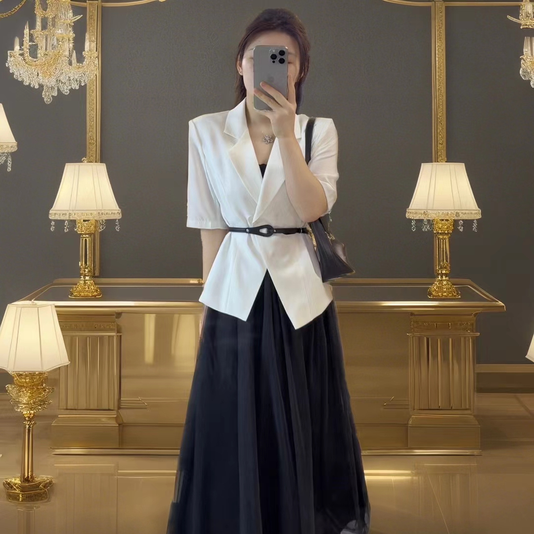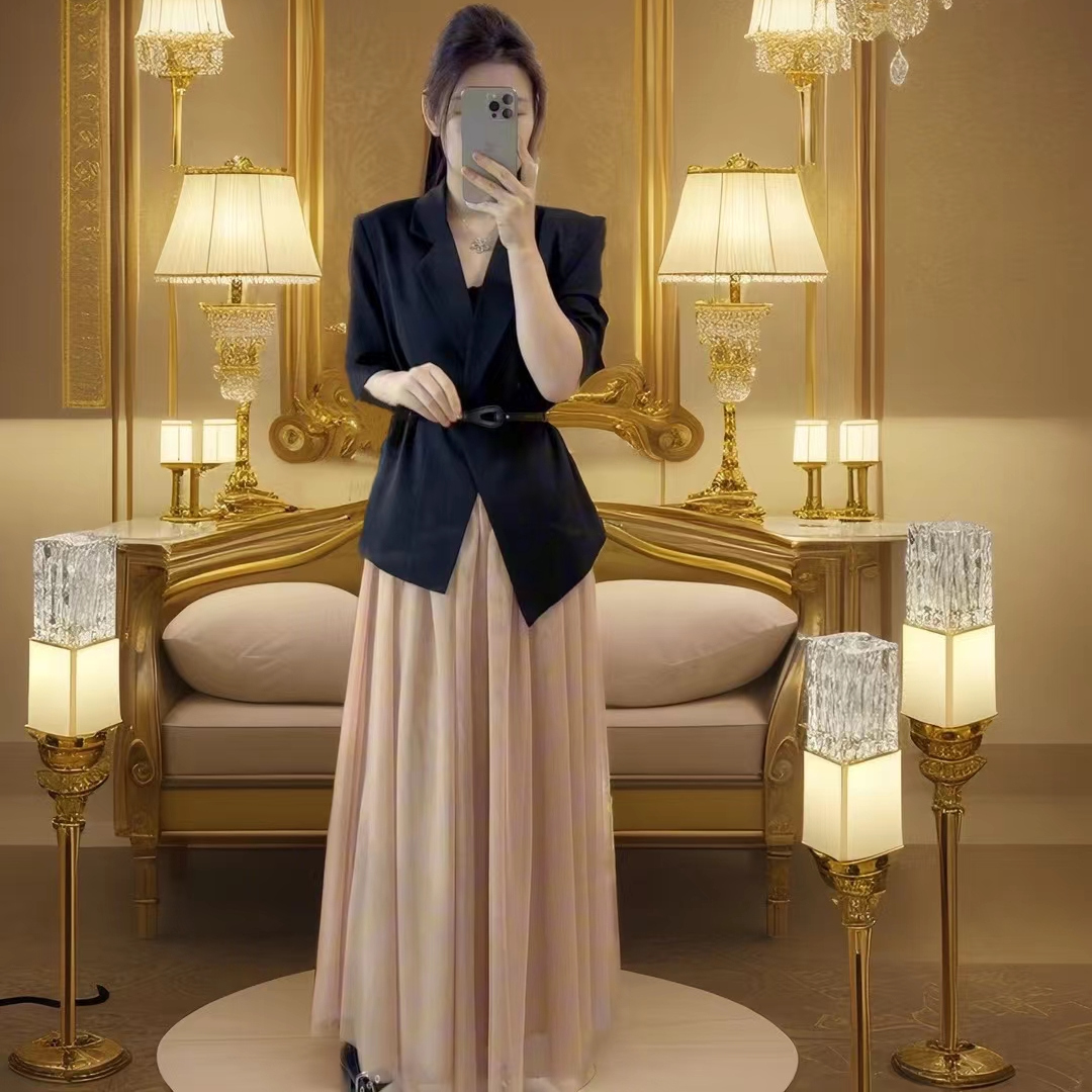 2025年春季网红新款时尚套装裙女法式西装领显瘦上衣+网纱半身裙