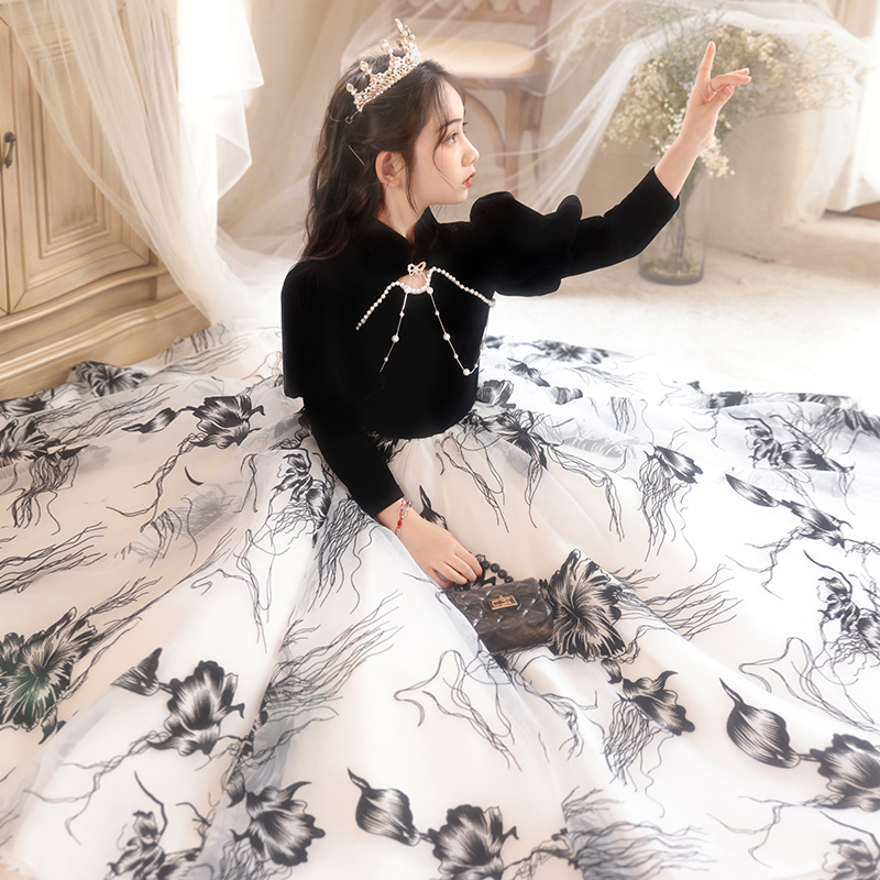 女大童黑色钢琴小提琴花童生日礼服赫本风公主裙小女孩高端蓬蓬裙