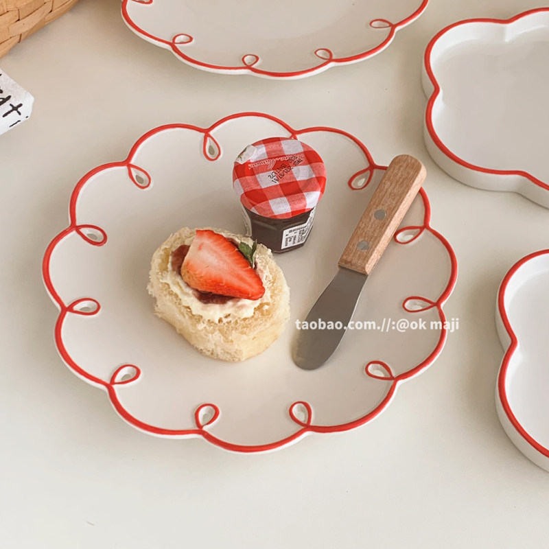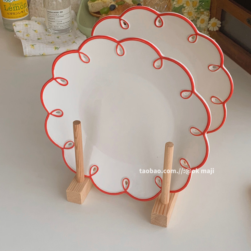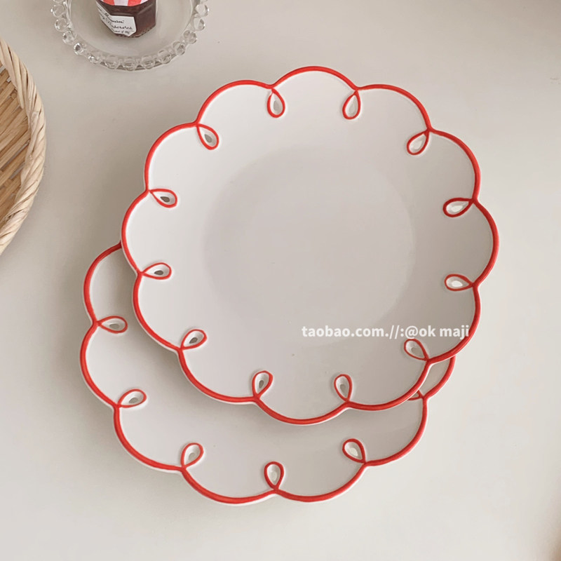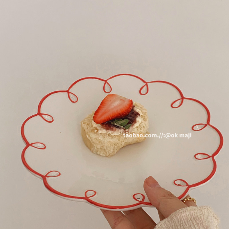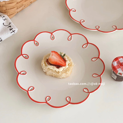 ok maji 韩国复古ins风波浪花边甜品蛋糕盘子家用陶瓷餐具水果盘