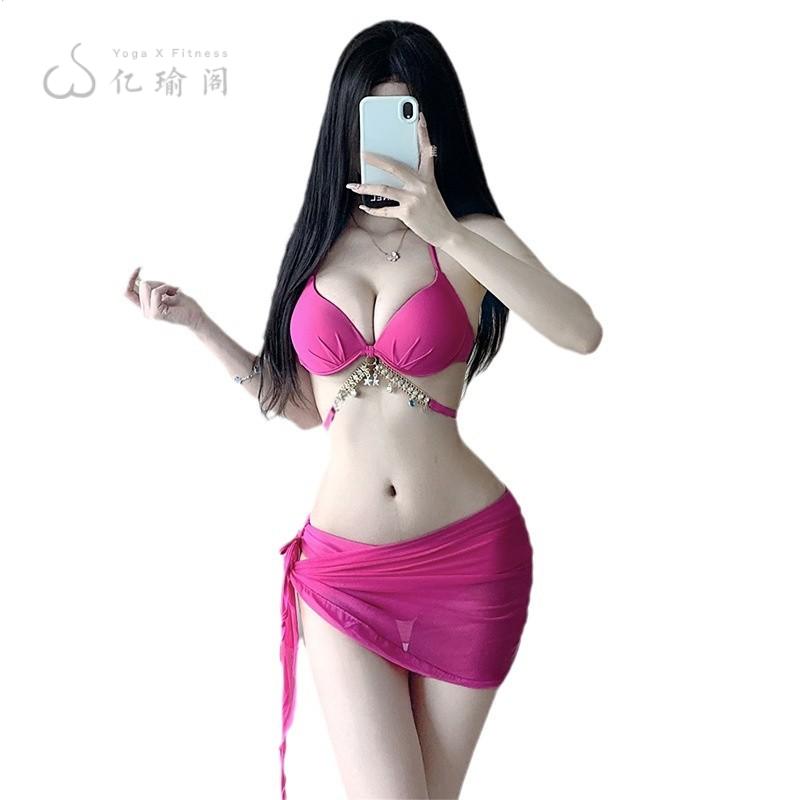爆款黑色性感小胸聚拢加厚带钢托钻链比基尼度假温泉三件套泳衣女