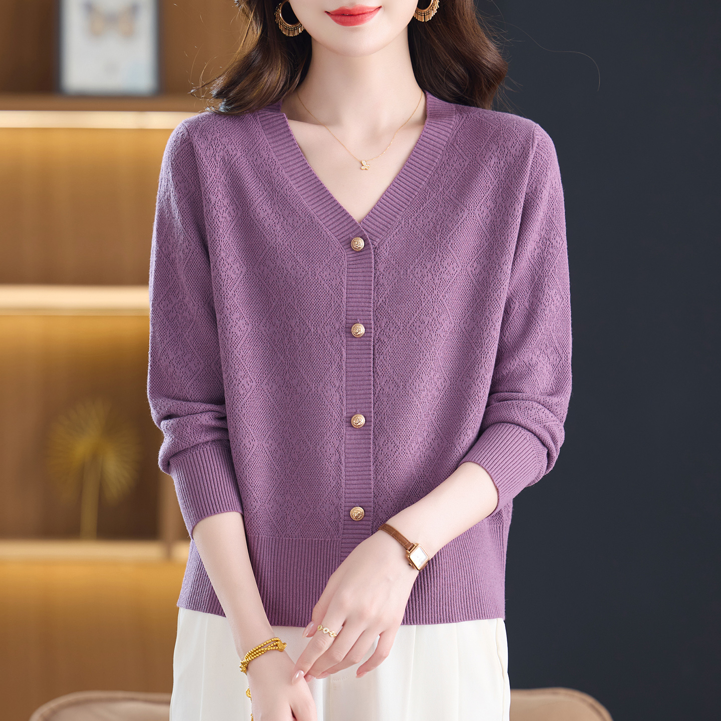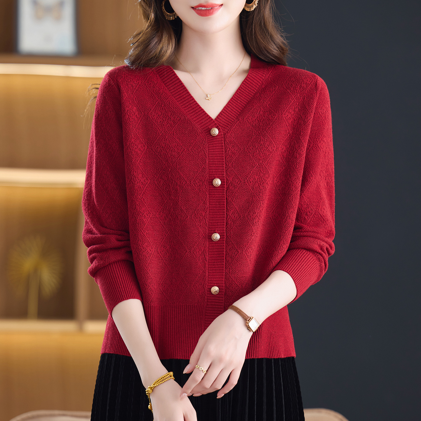 鄂尔多斯市V领针织衫女开衫2025春秋新款羊毛衫短款宽松毛衣外套