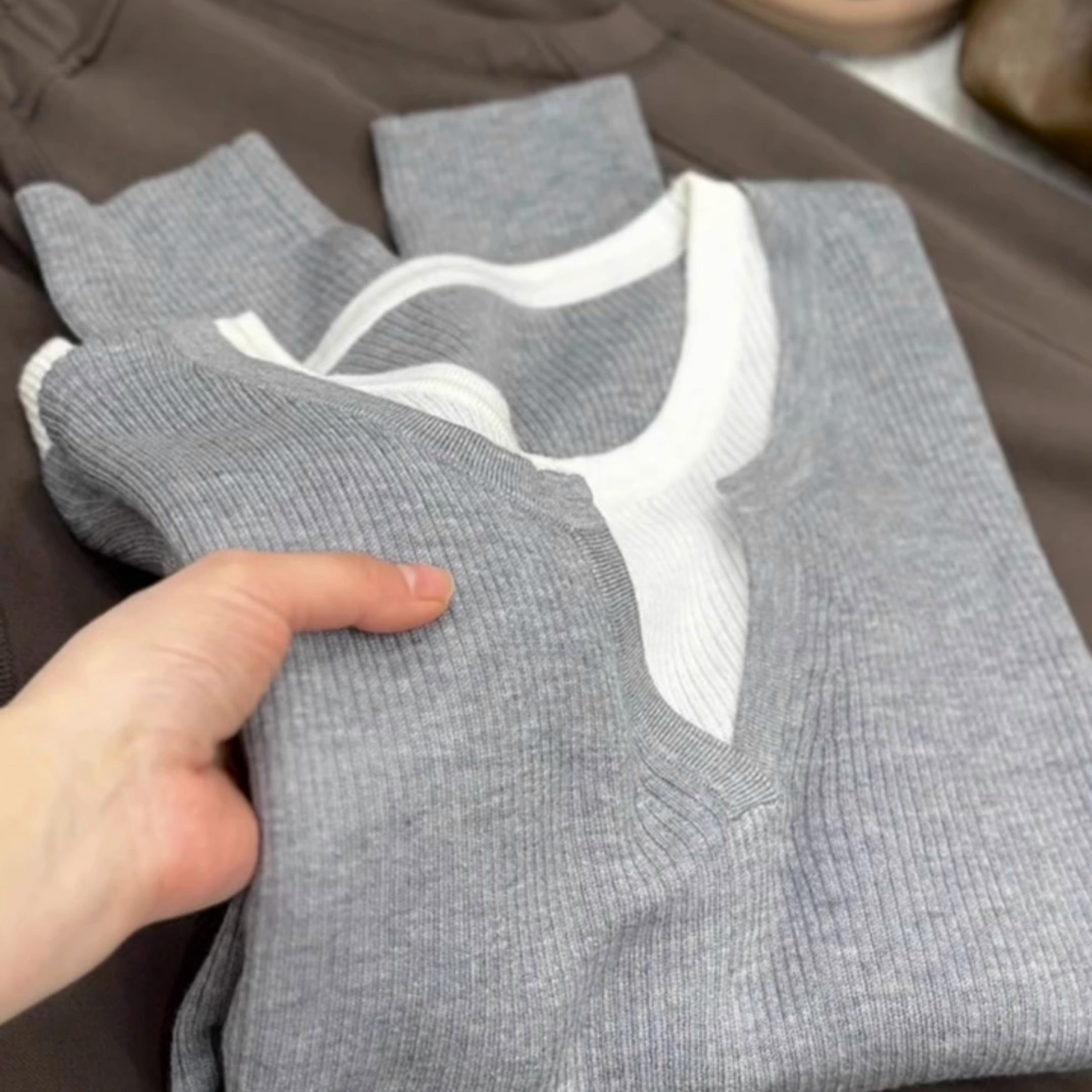 品牌折扣软糯V领假两件上衣女春秋季撞色减龄长袖毛衣打底针织衫