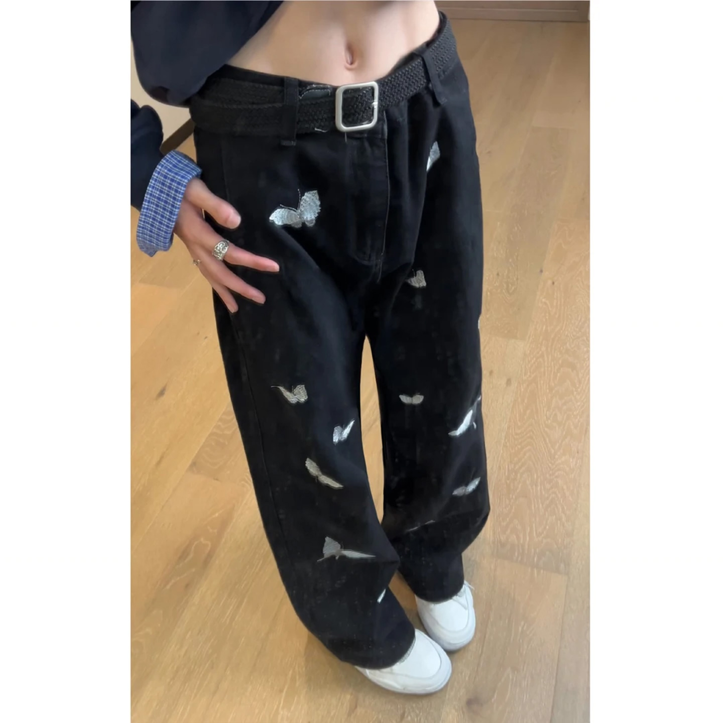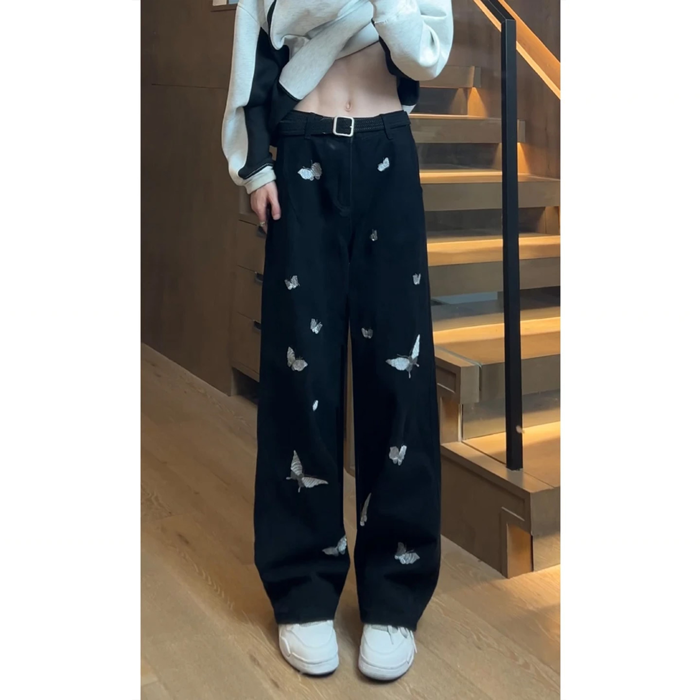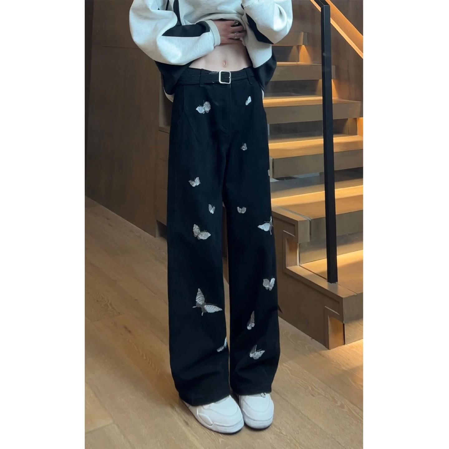 高级感蝴蝶刺绣水洗弯刀牛仔裤男女款宽松直筒高腰裤子秋季阔腿裤