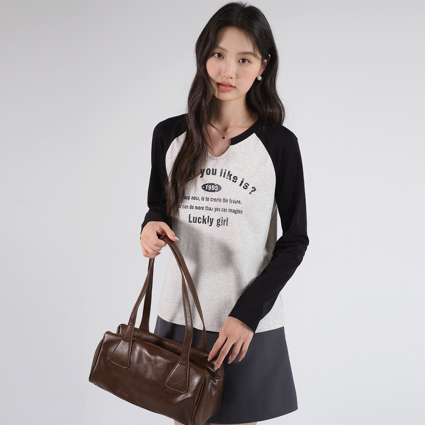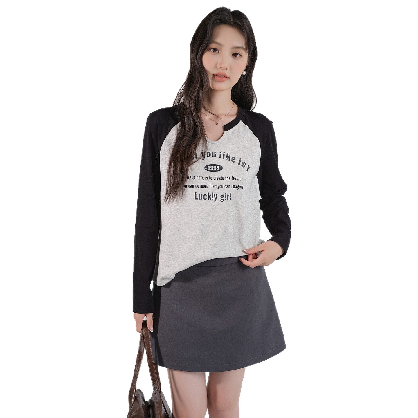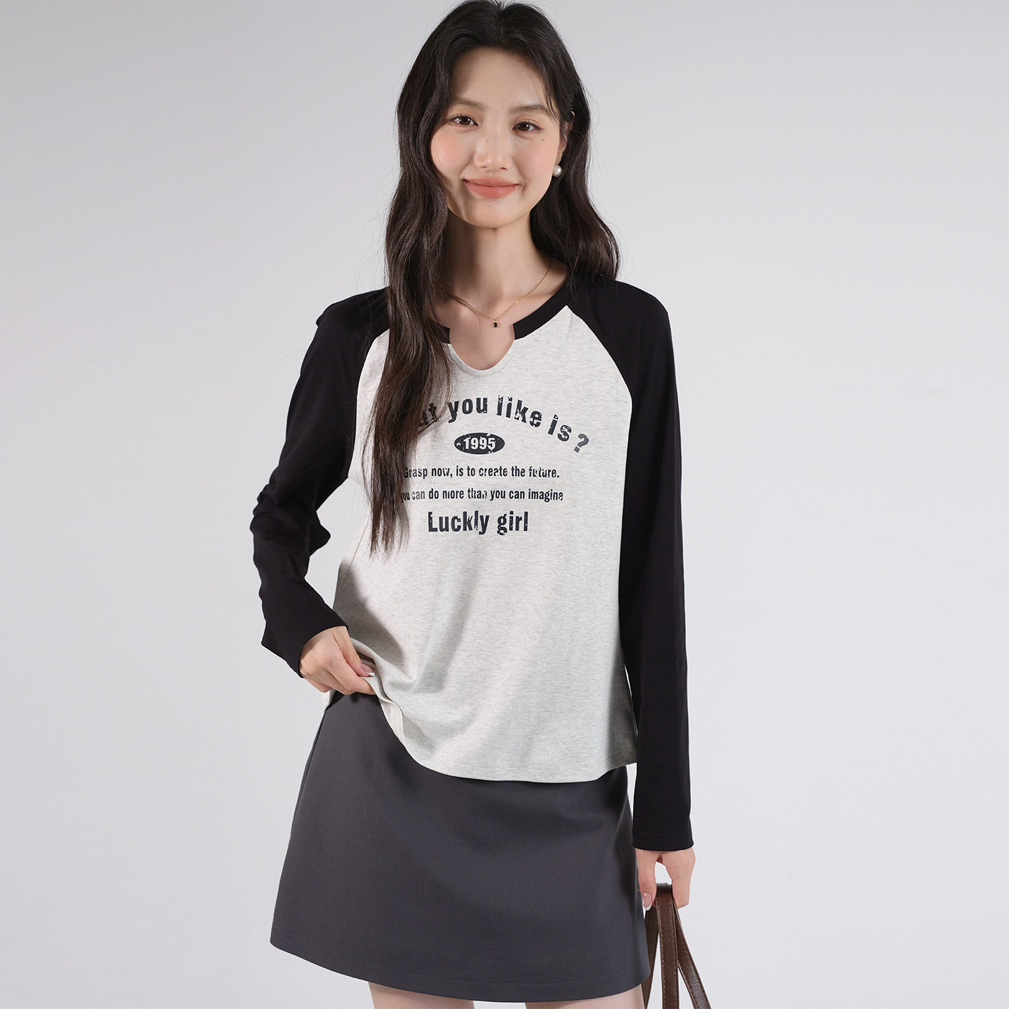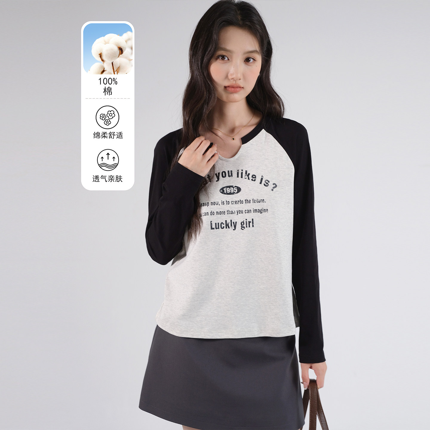 蓝若水大码女装撞色插肩袖V领T恤胖mm春装新款美式字母印花打底衫