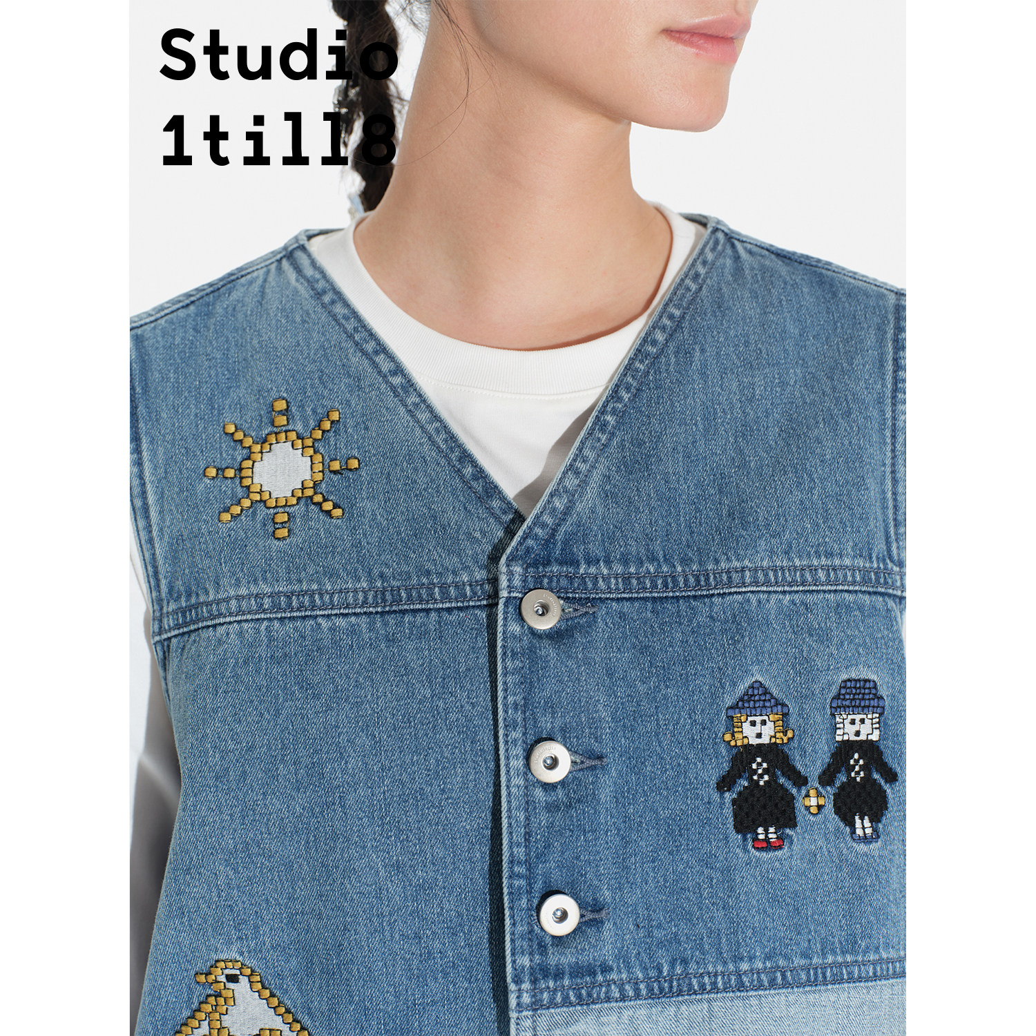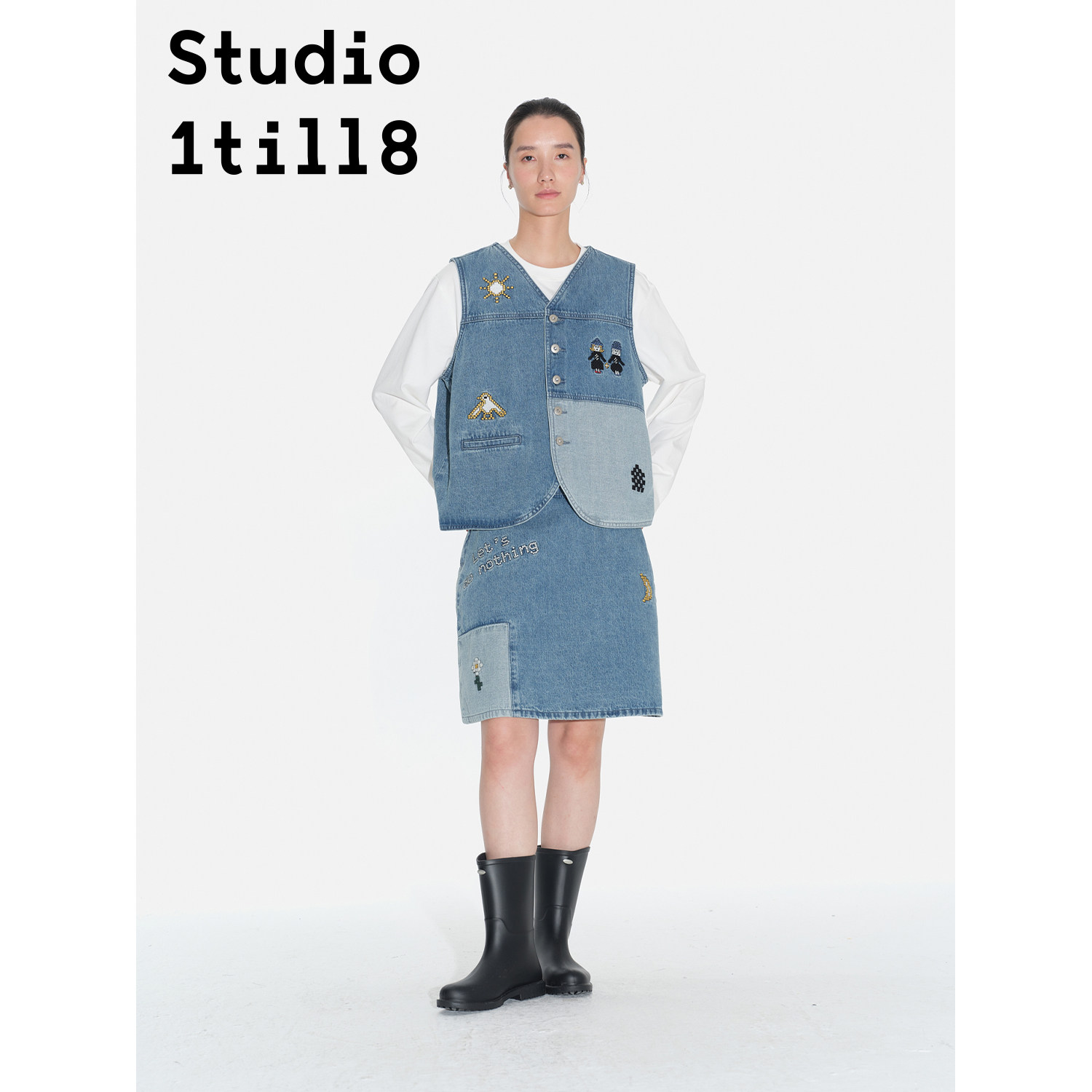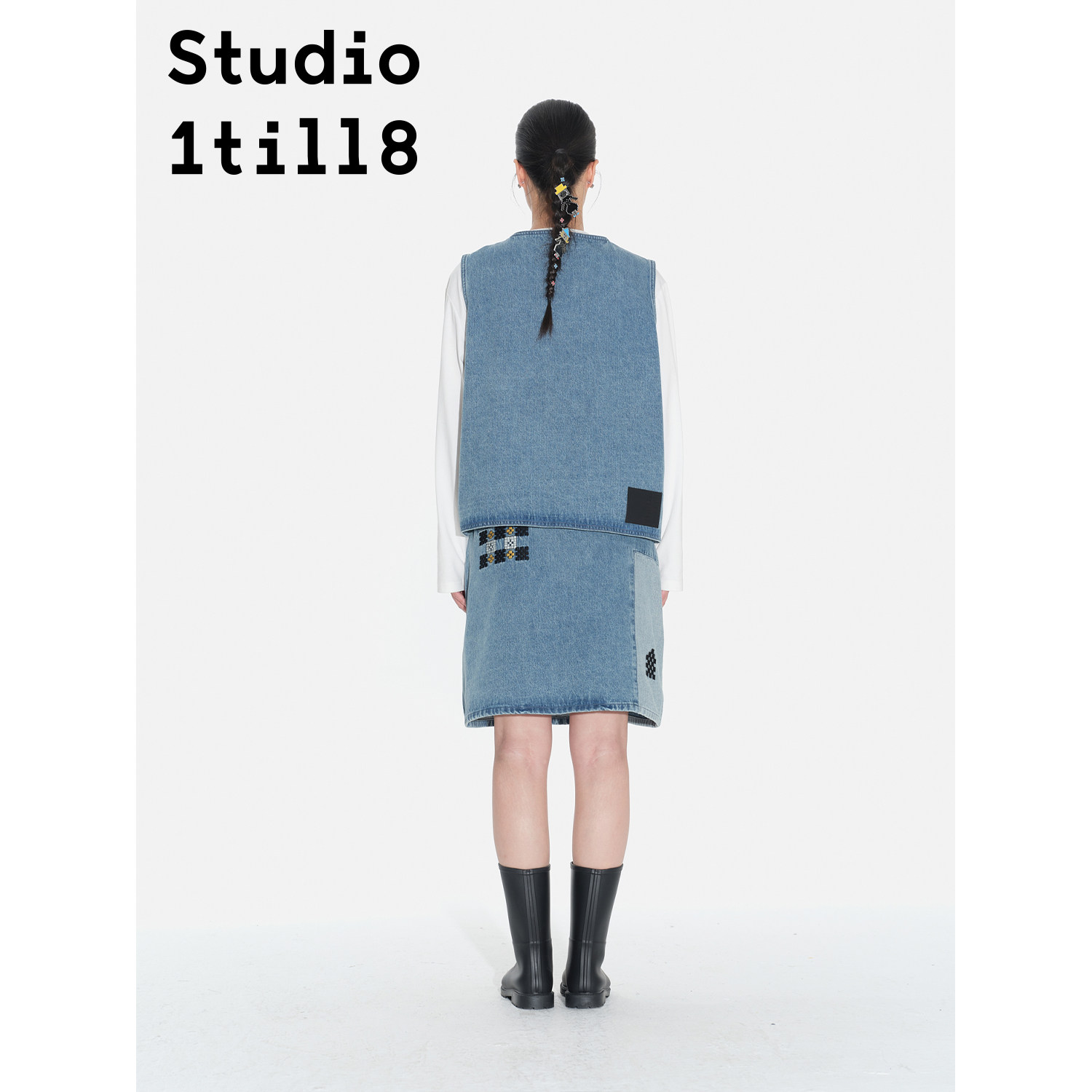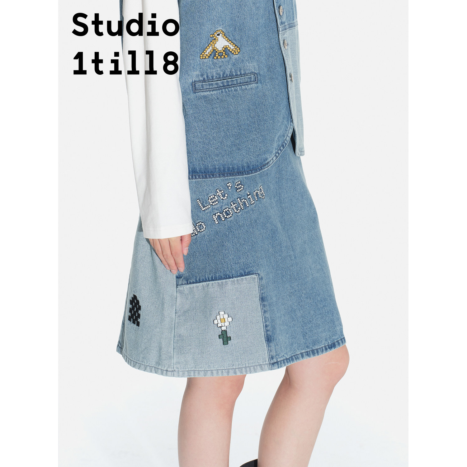 Studio1till8 牛仔蓝 像素刺绣牛仔背心/半裙