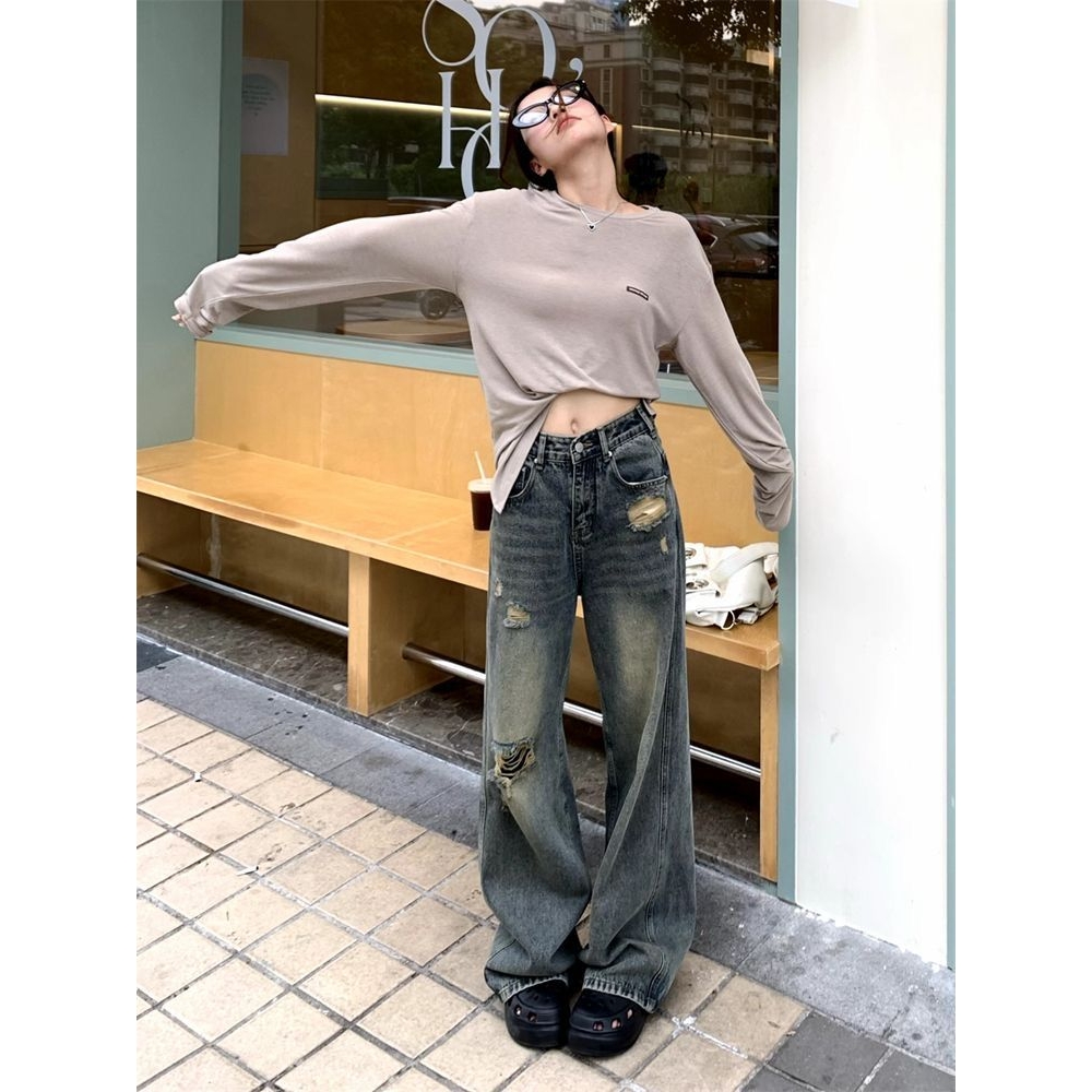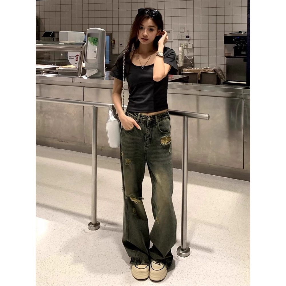 美式复古不规则毛边破洞牛仔裤女小个子高腰直筒宽松显瘦阔腿长裤