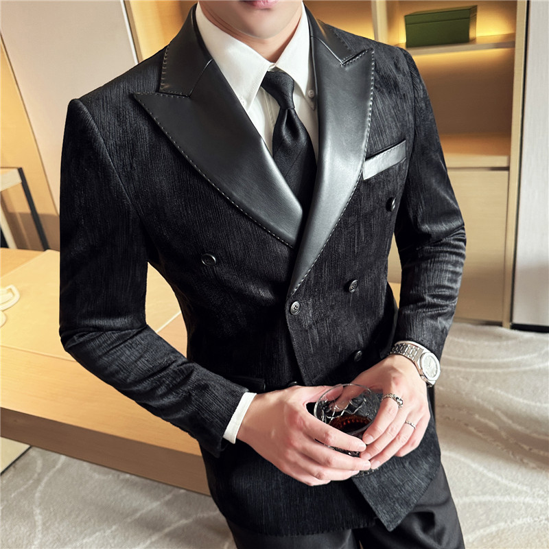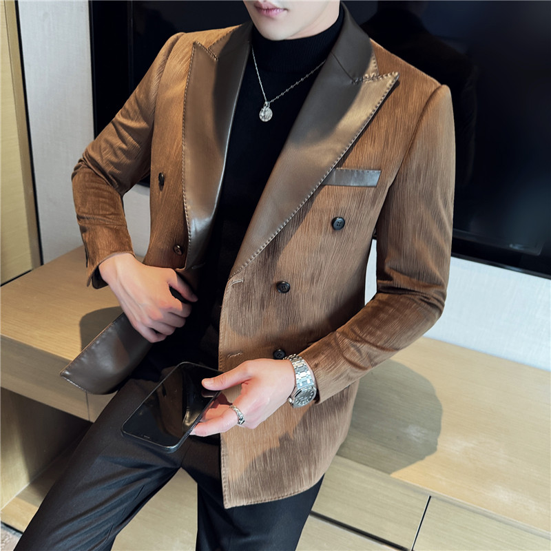 秋冬轻奢潮流拼皮西装外套韩版修身男士绒布时尚西服英伦休闲单西