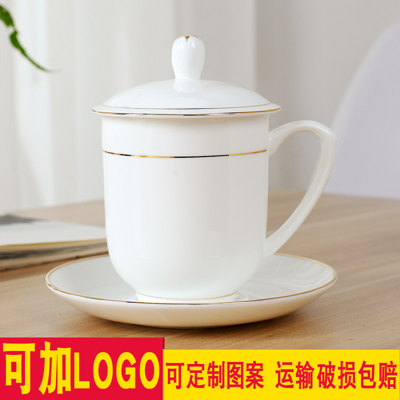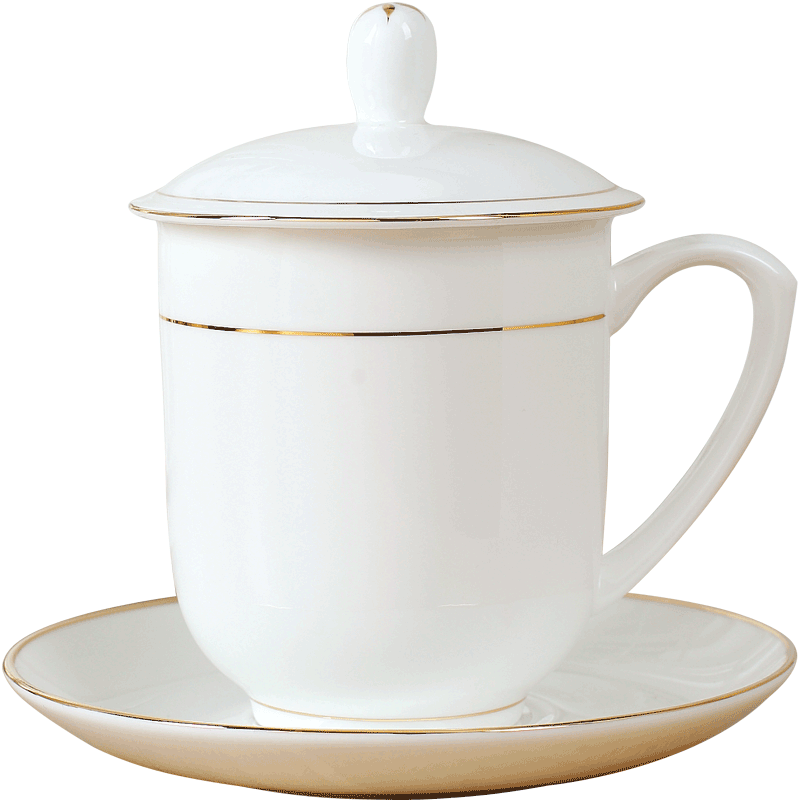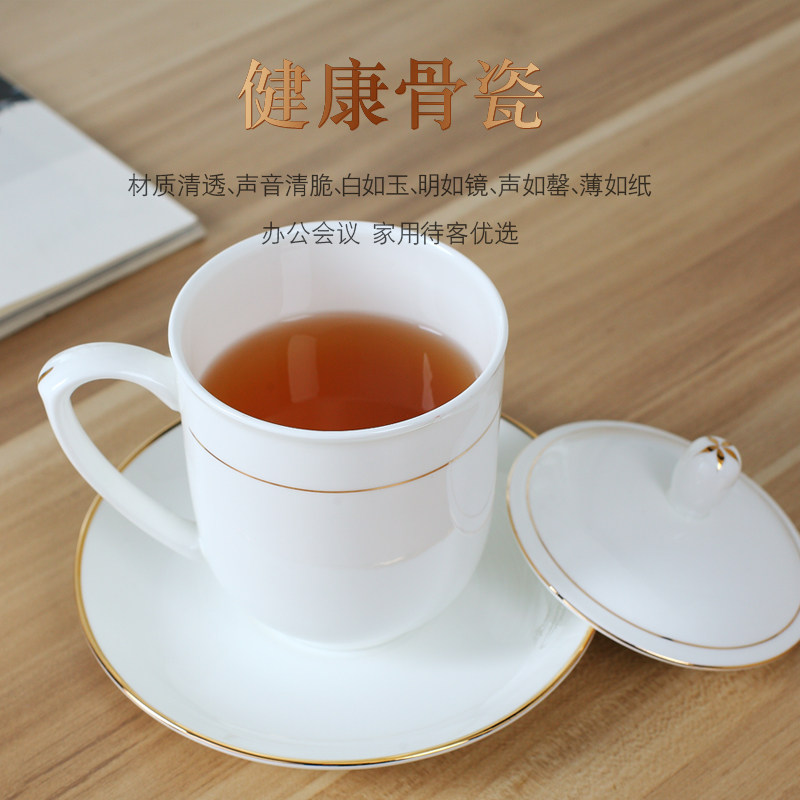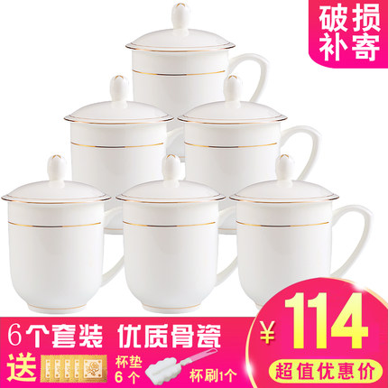 景德镇茶杯陶瓷带盖办公室会议室茶杯骨瓷带盖金边盖杯6只