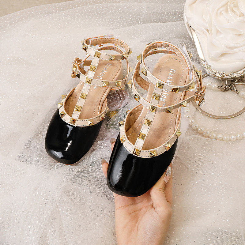 女童铆钉高跟凉鞋2024夏季新款红色黑色包头中空公主鞋时尚百搭鞋