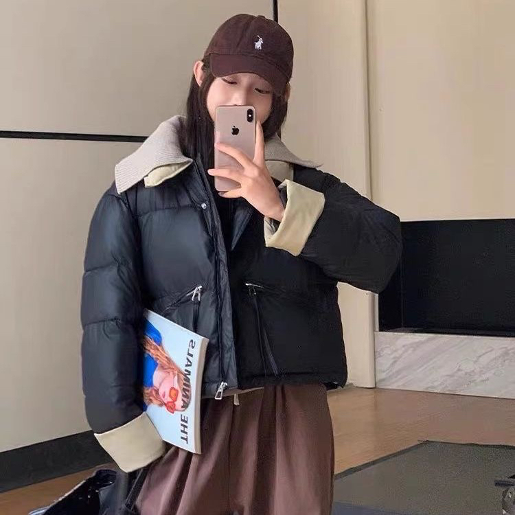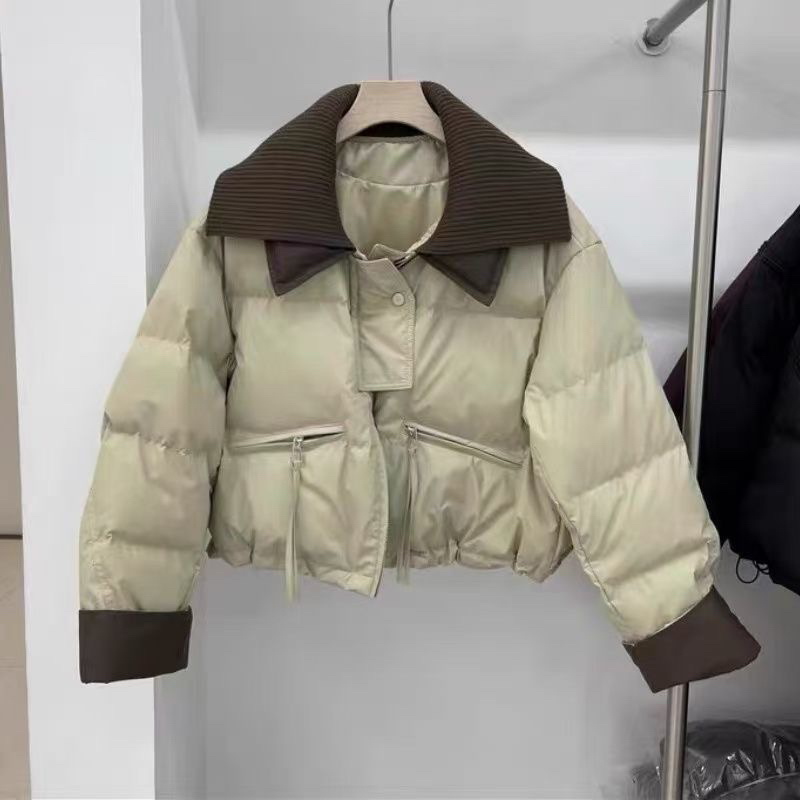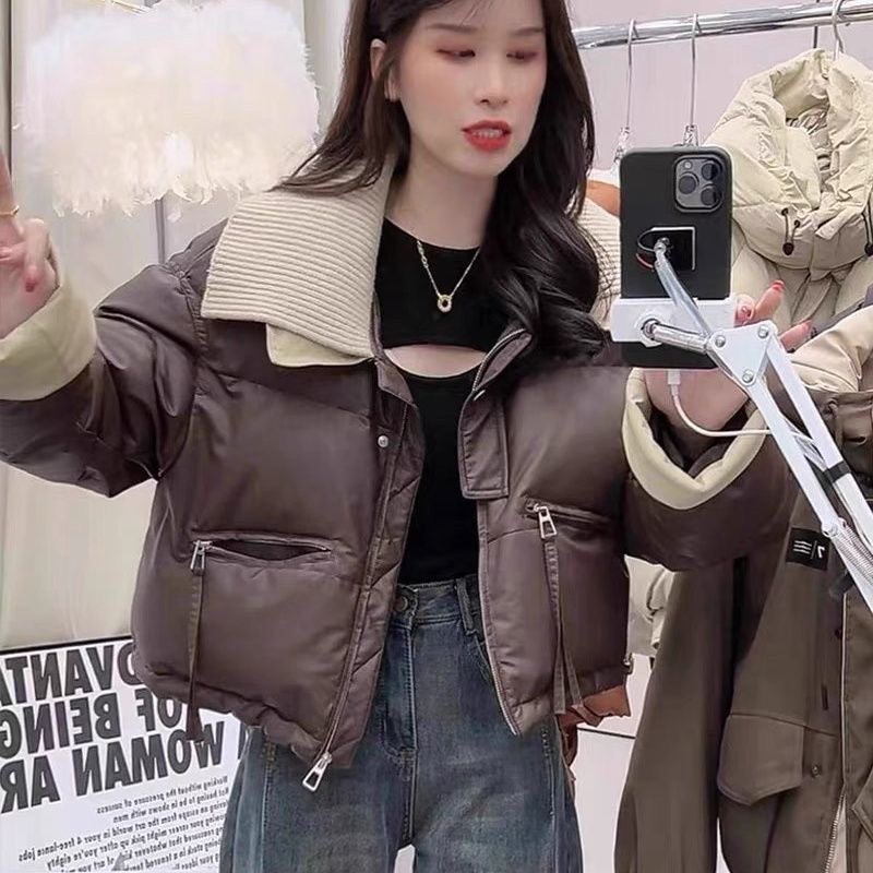 2025年新款羽绒棉女短款针织翻领PU面皮质免洗减龄白鸭绒外套潮