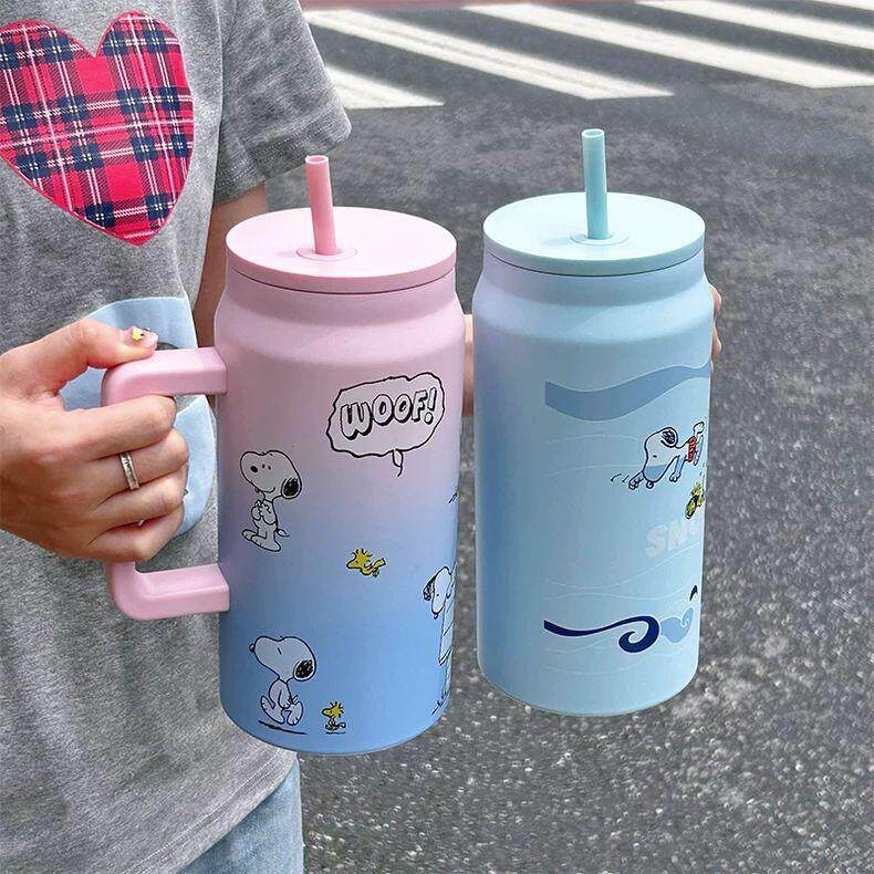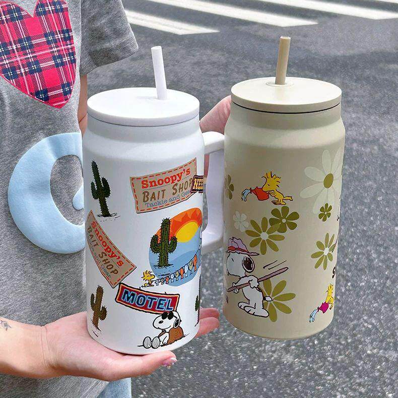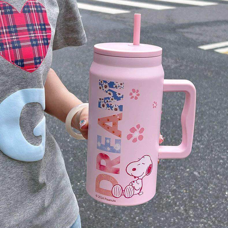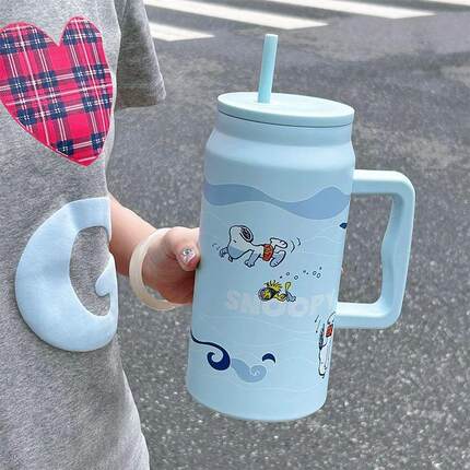 史努比保温杯有手柄超大容量女士办公室咖啡杯吸管水杯2024新款