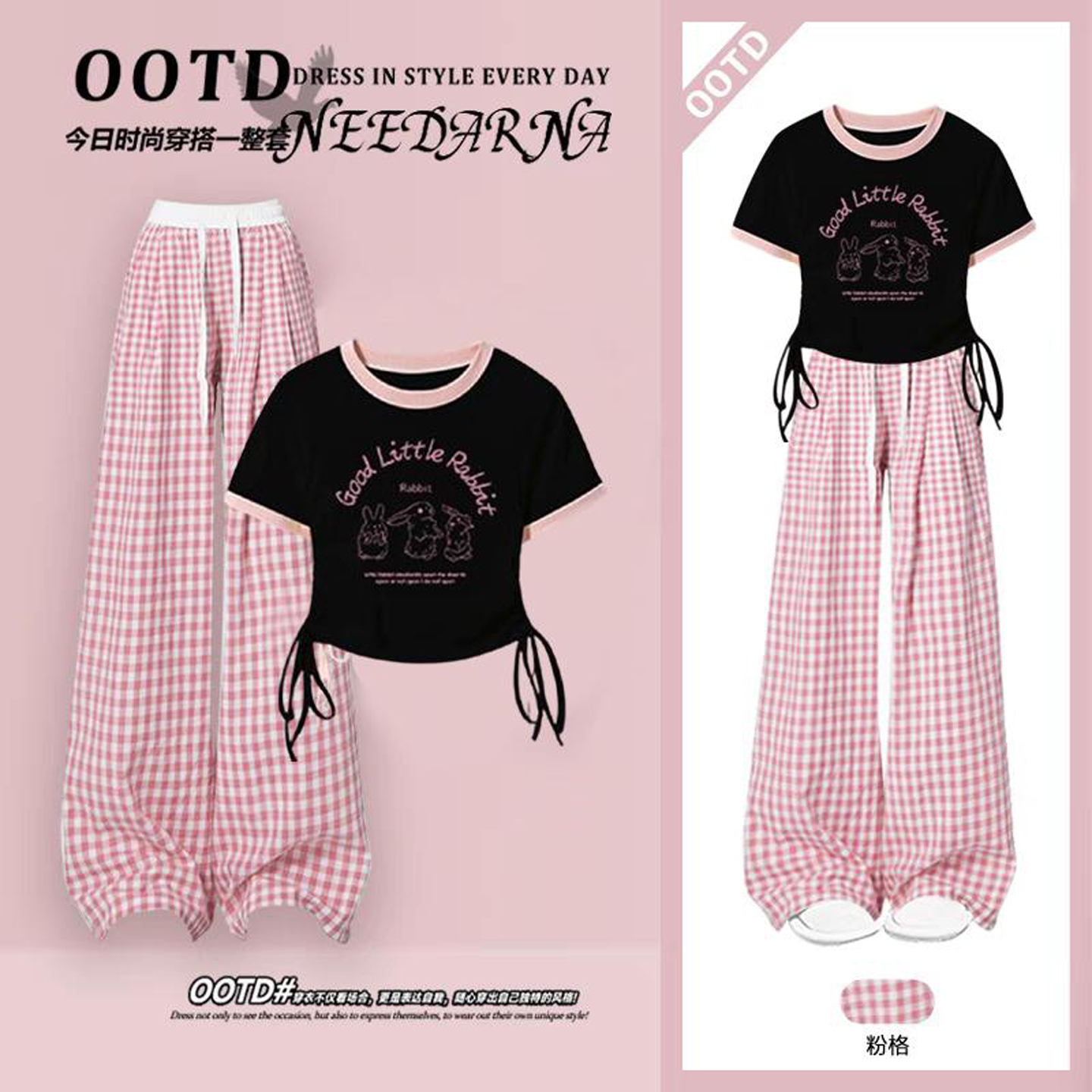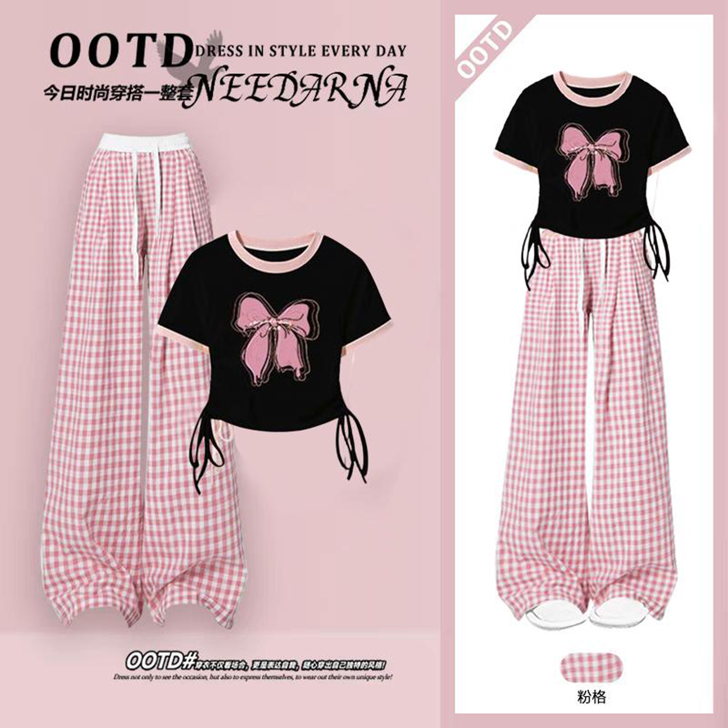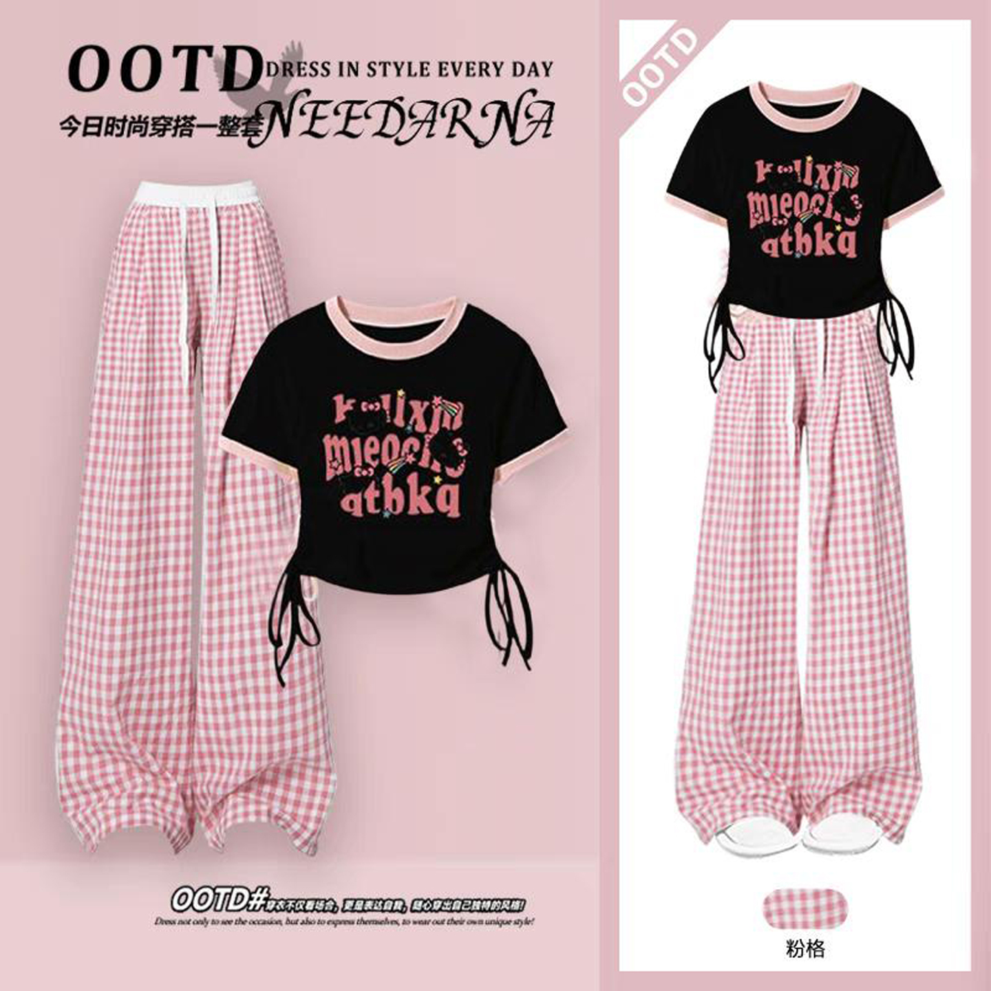 女大童夏季新款多巴胺穿搭粉色抽绳T恤+格子阔腿裤休闲两件套装