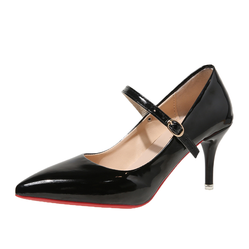 35-45大码高跟鞋新款春秋黑色细跟性感浅口一字扣带不掉跟加胖宽