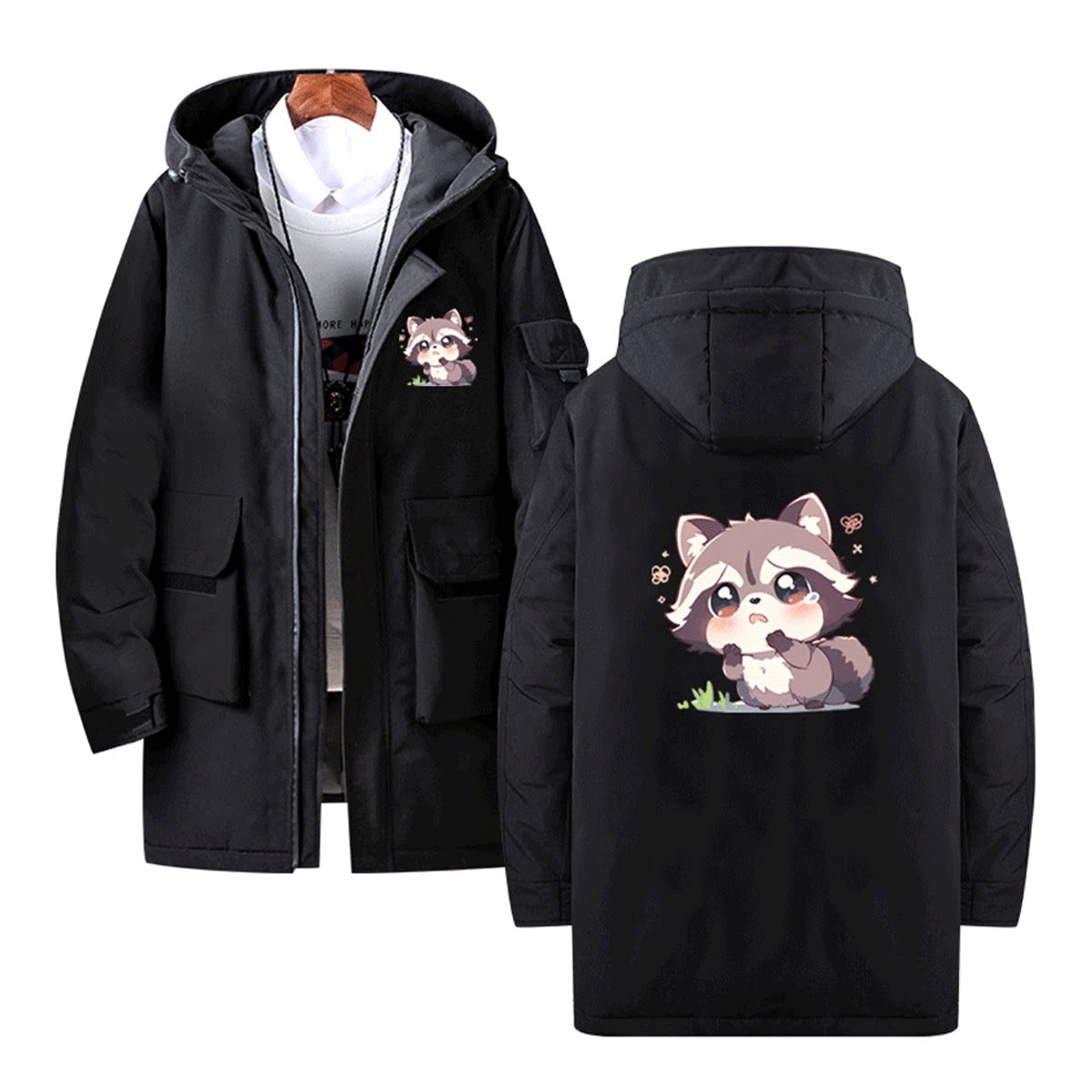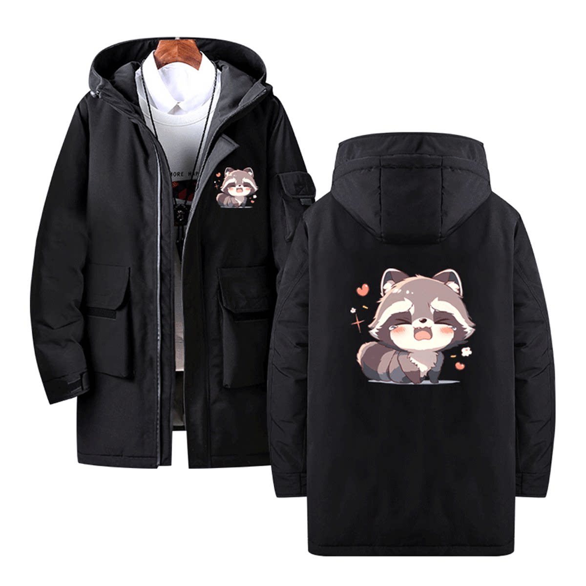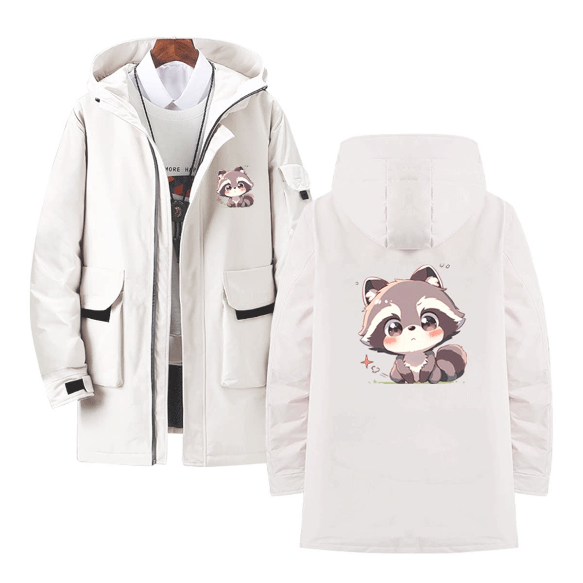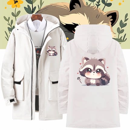 可爱小浣熊男女情侣装上衣服春秋冬季休闲可定制中长款连帽羽绒服