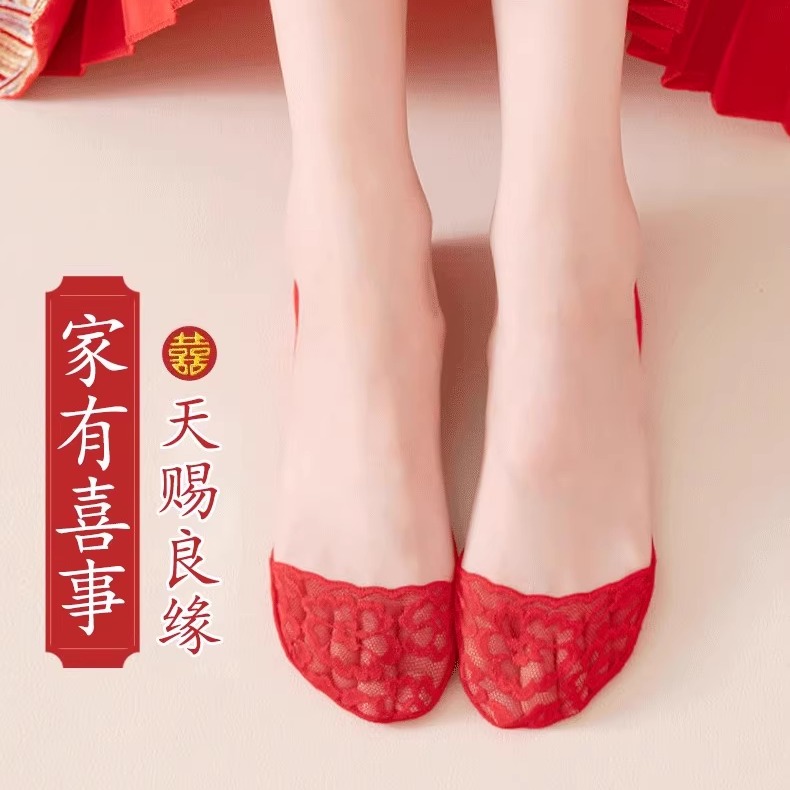 红袜子结婚情侣一对红色蕾丝男女士新娘船袜底隐形高跟鞋薄款新婚