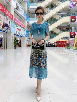 2023夏新款女气质显瘦减龄中长款真丝桑蚕丝中年妈精美印花连衣裙